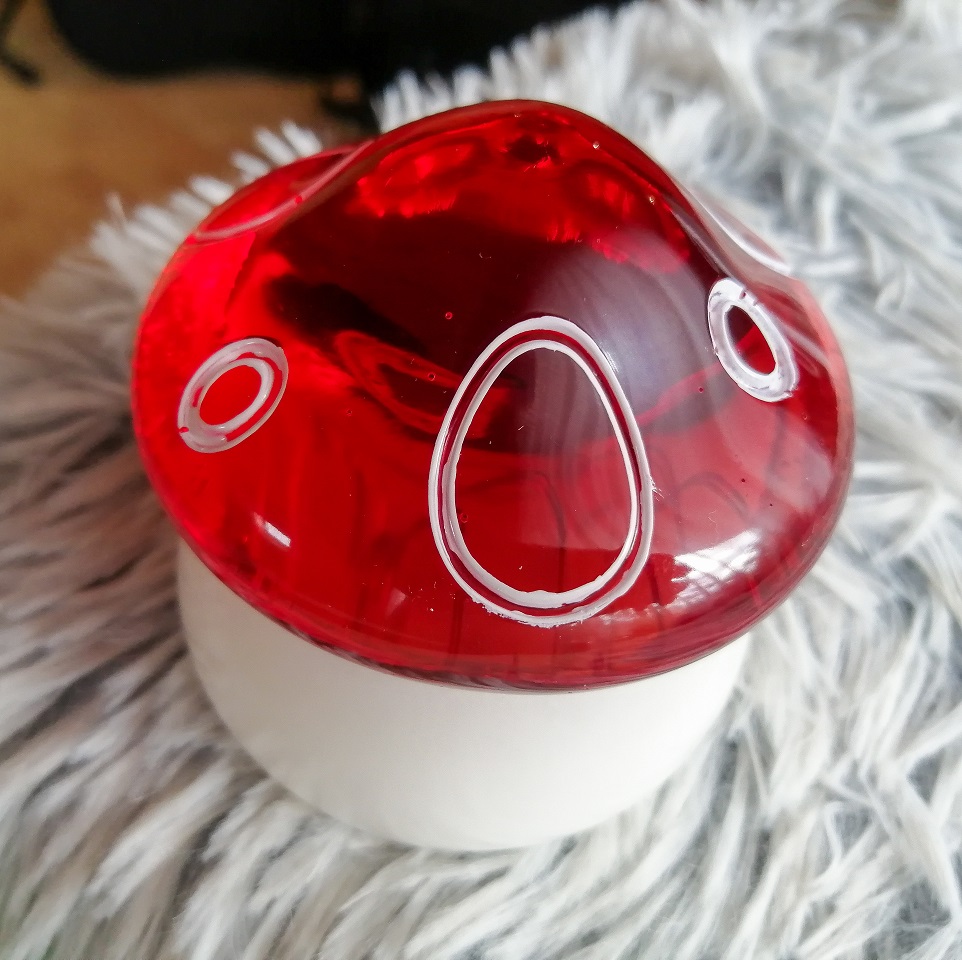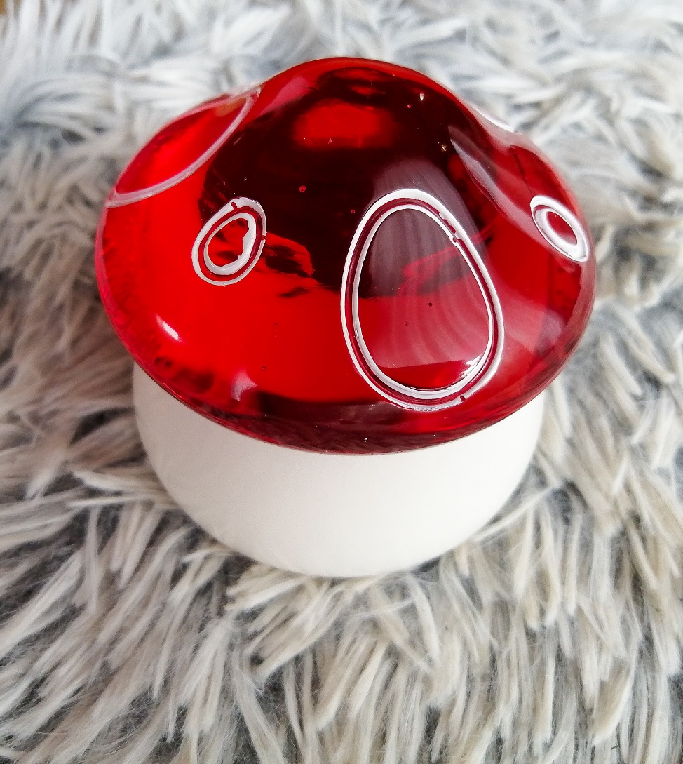 Unikatna, ročno izdelana posoda v obliki gobe, s pokrovom, je narejena iz epoksi smole, alkoholnega črnila in pigmentne paste.