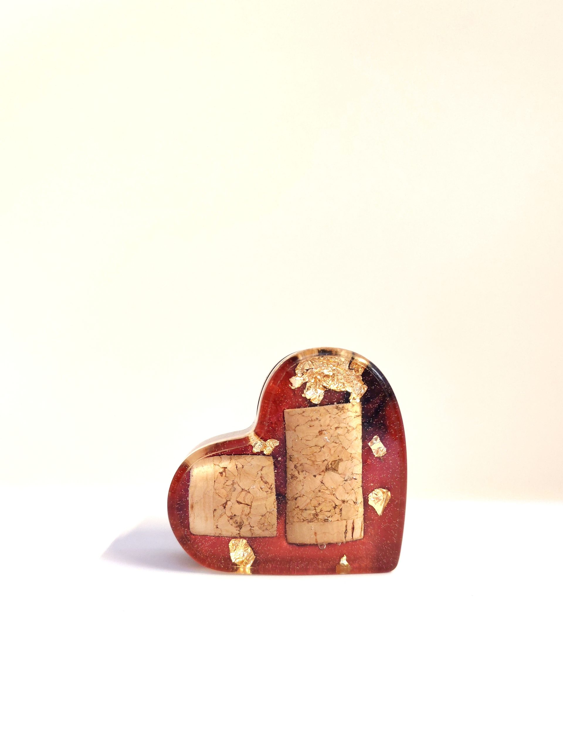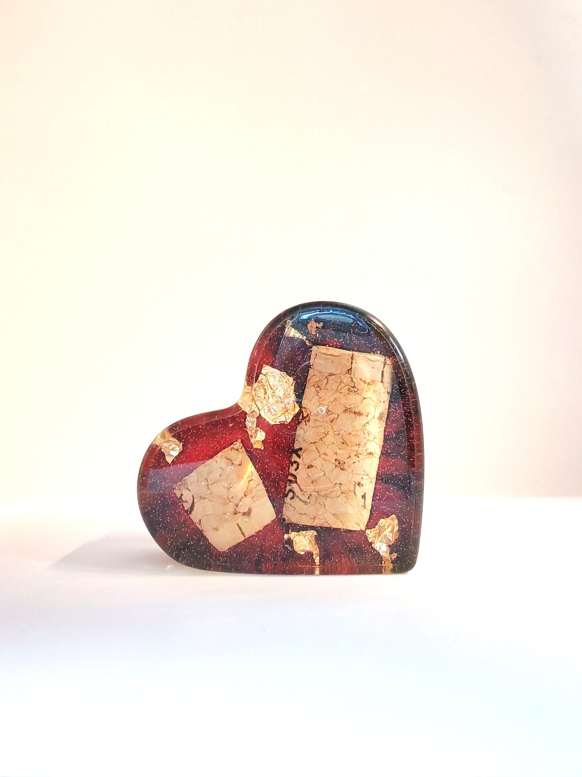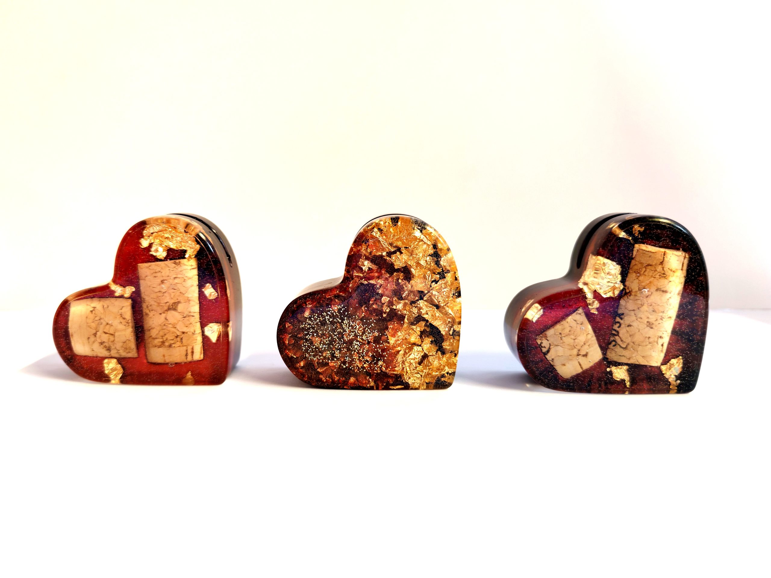 • Črna in rdeča, s pluto in zlatimi lističi – temno črna smola, obogatena s čudovitimi koščki vinsko rdeče in naravne vinske plute z nežnimi poudarki zlatih lističev