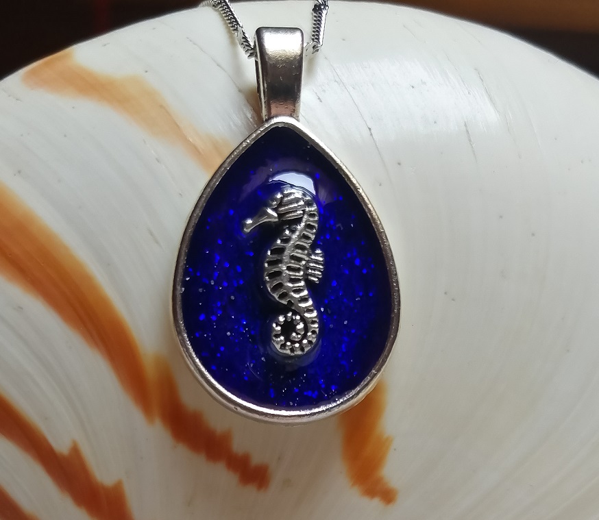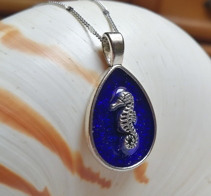 Čudovita ročno izdelana ogrlica iz smole, ki jo je navdihnilo morje, z morskim konjičkom. Obesek je iz smole na kovinski podlagi. Vsi kovinski deli so brez niklja, zato so primerni tudi za ljudi, ki trpijo za alergijami.