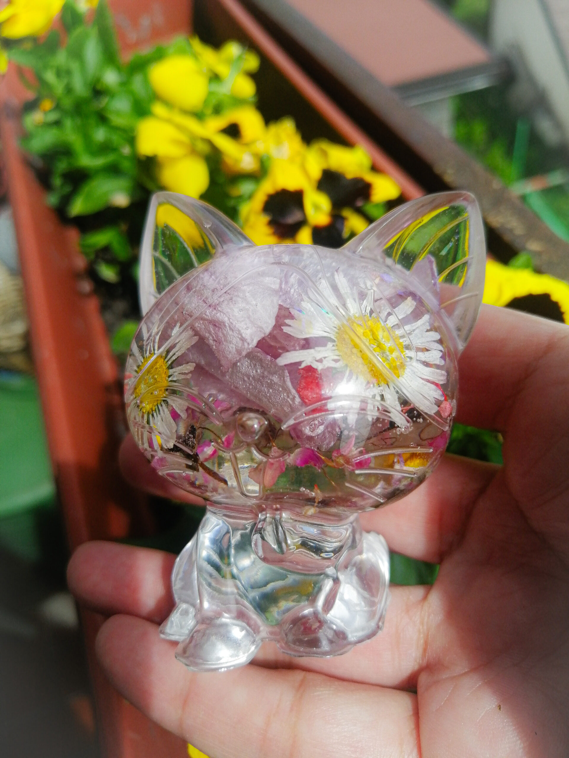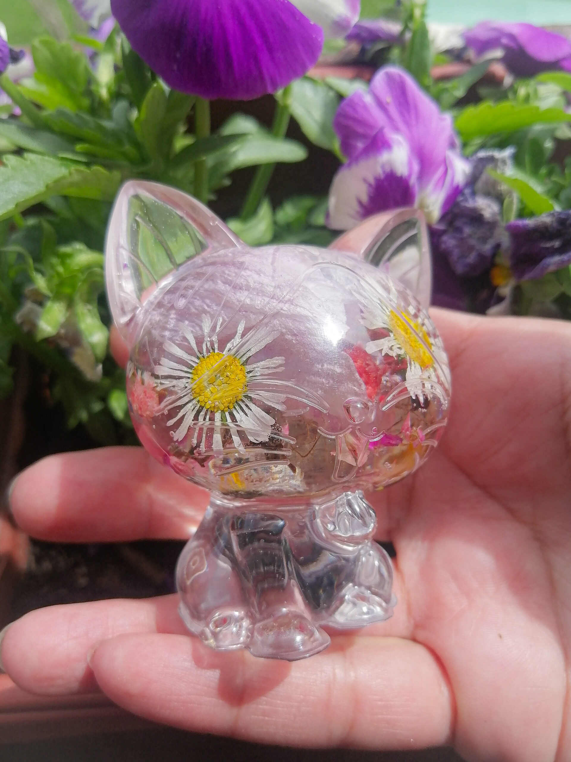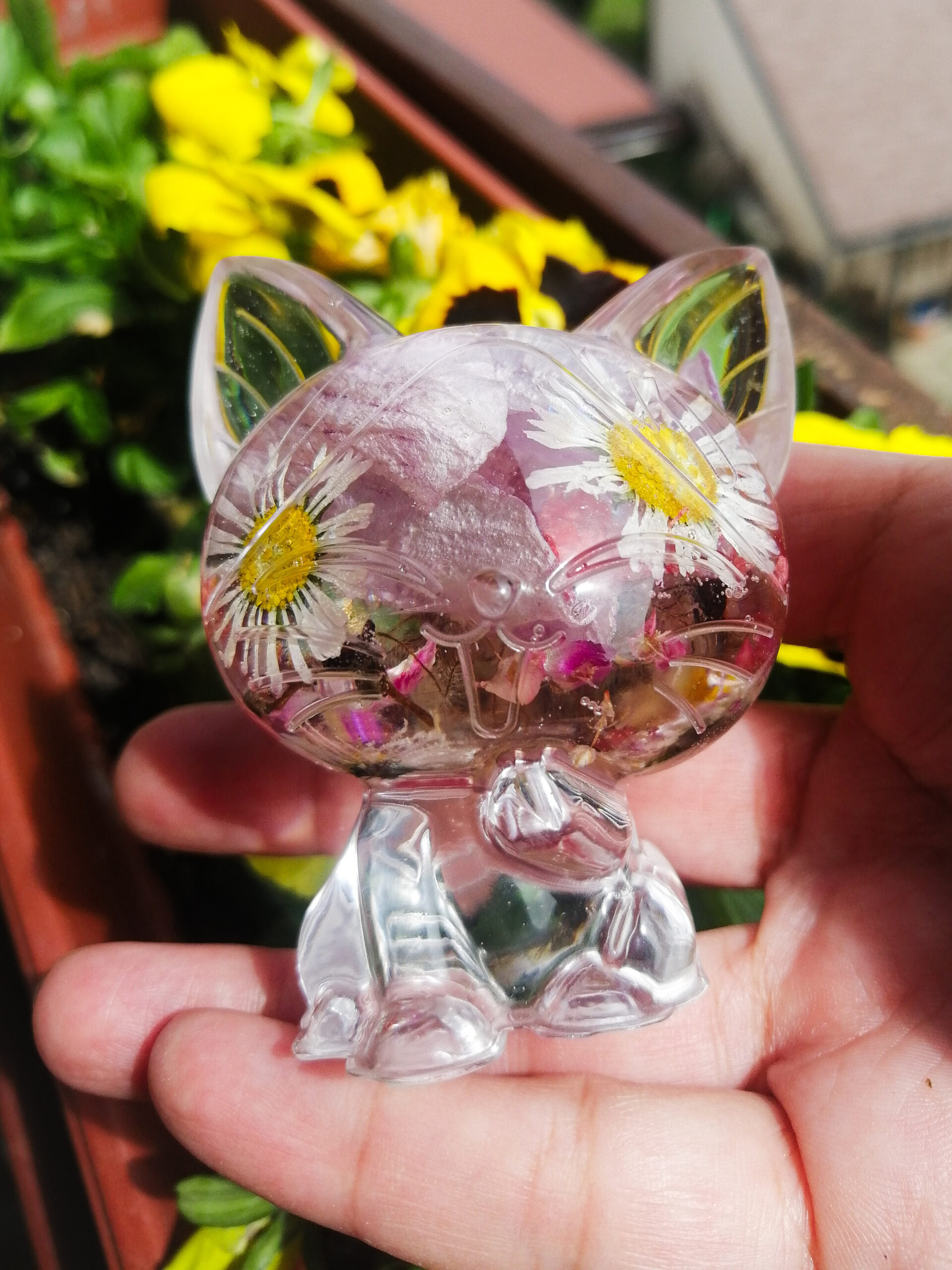 Čudovita ročno izdelana figurica mačke z ročno nabranimi in posušenimi spomladanskimi rožami za vse ljubitelje mačk. Uživajte v lepoti narave s to umetnino. Odličen dodatek k vaši zbirki figuric! Uporabite jo lahko tudi kot lahek pritisk za papir v svoji pisarni.