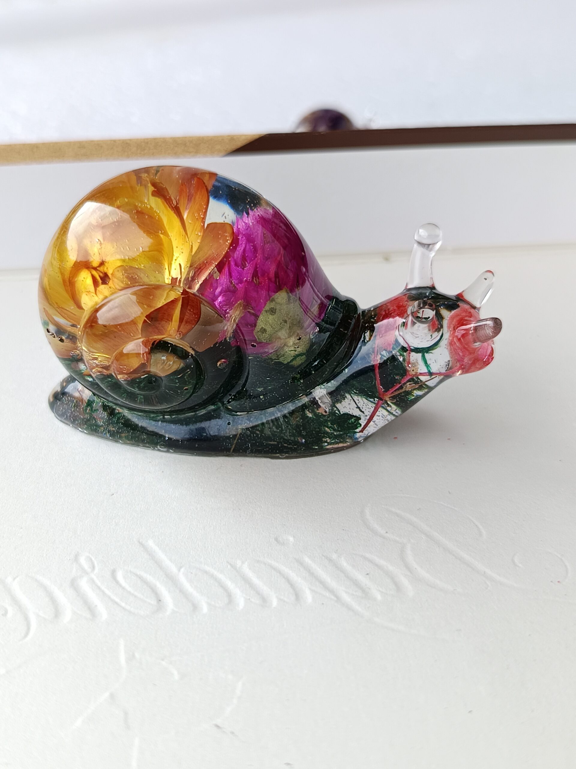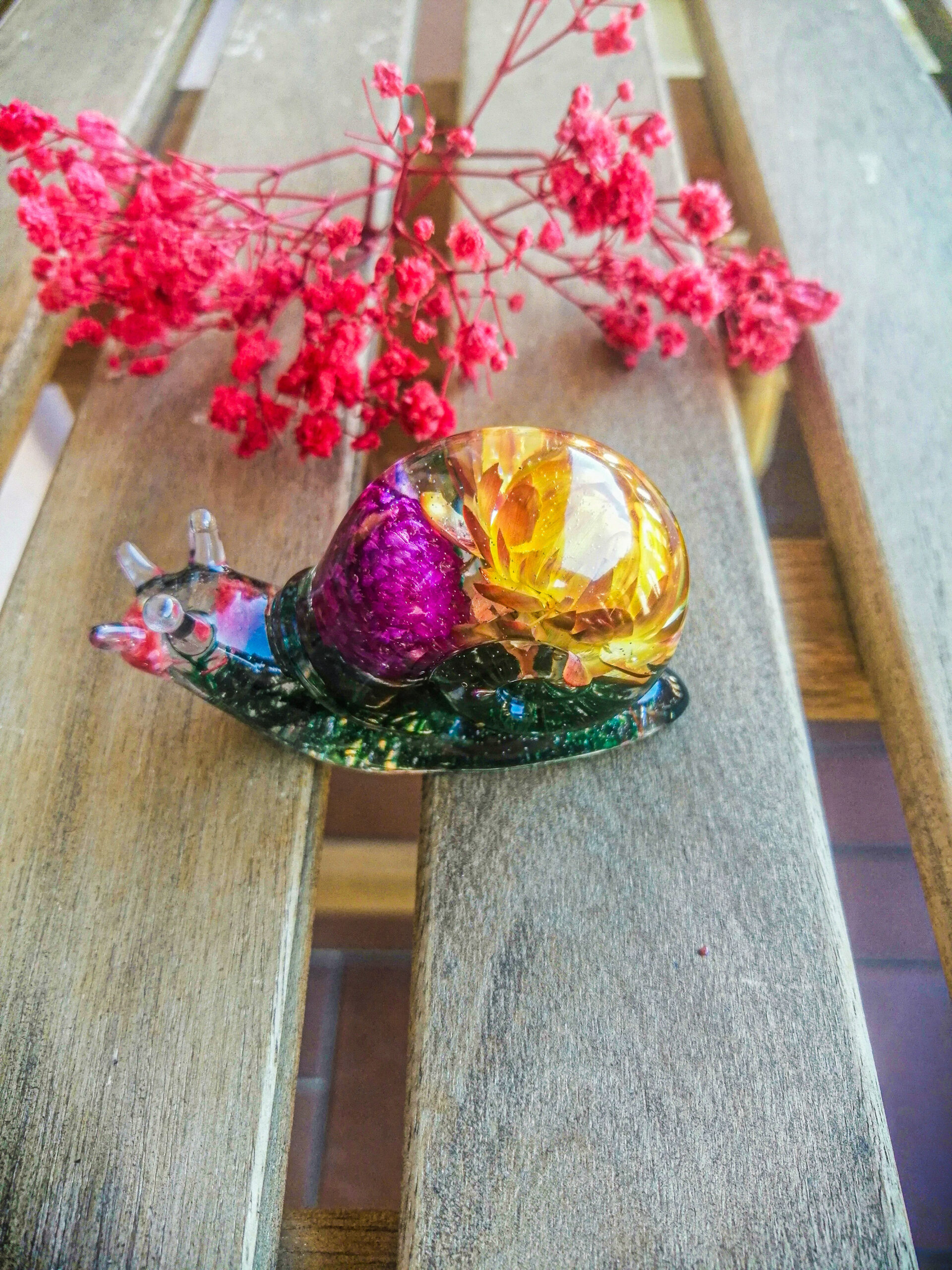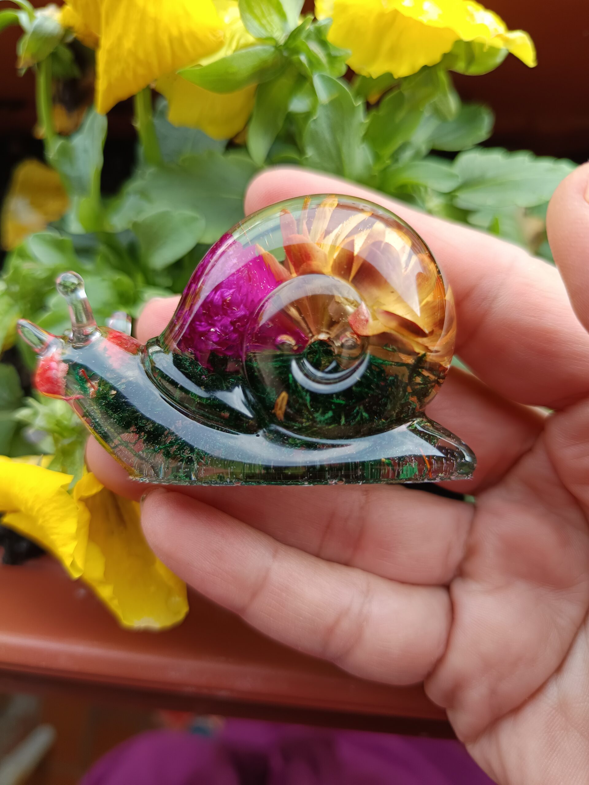 Tega čudovitega polžka sem naredila z epoksi smolo, pravimi posušenimi rožami in pravim mahom.
