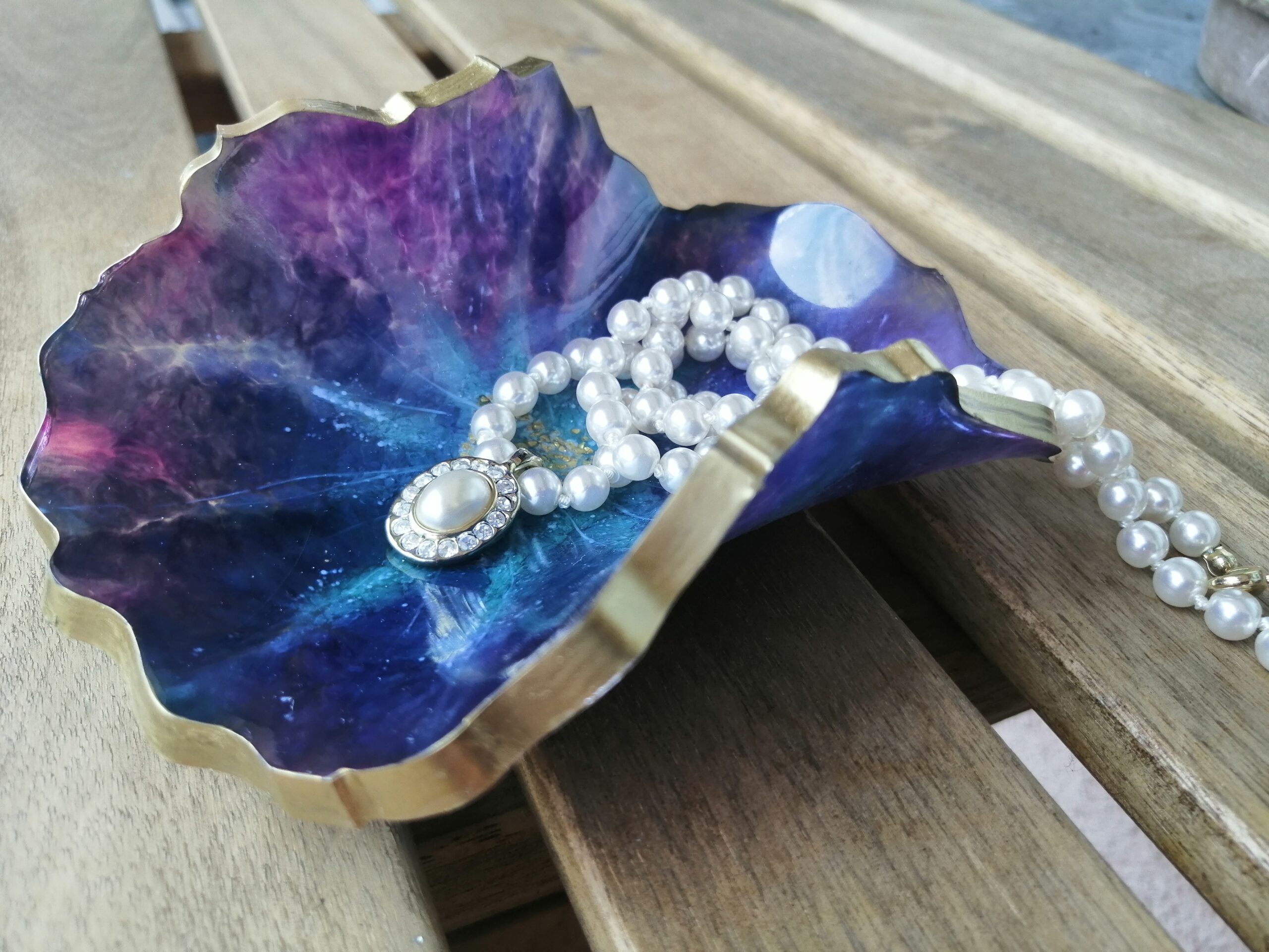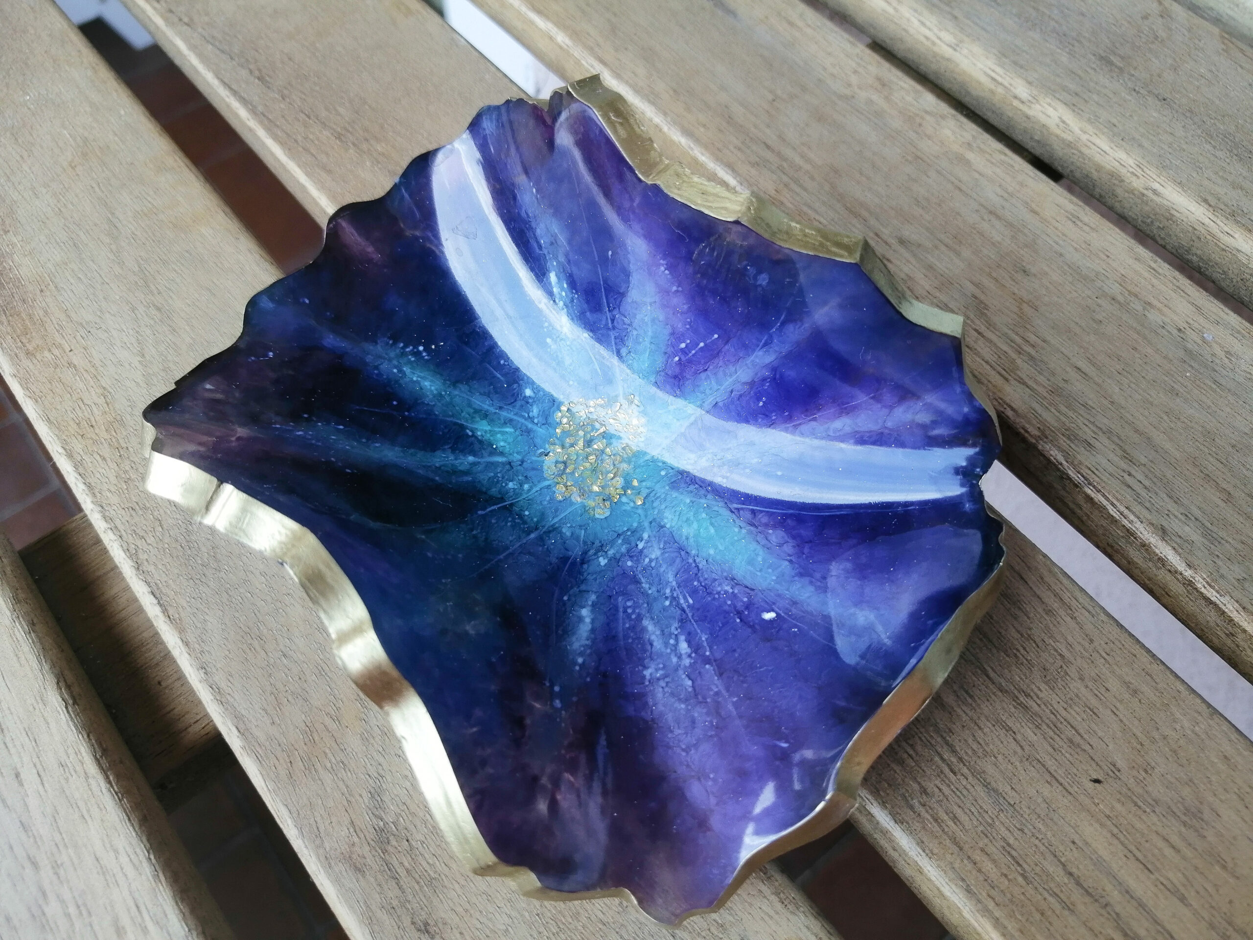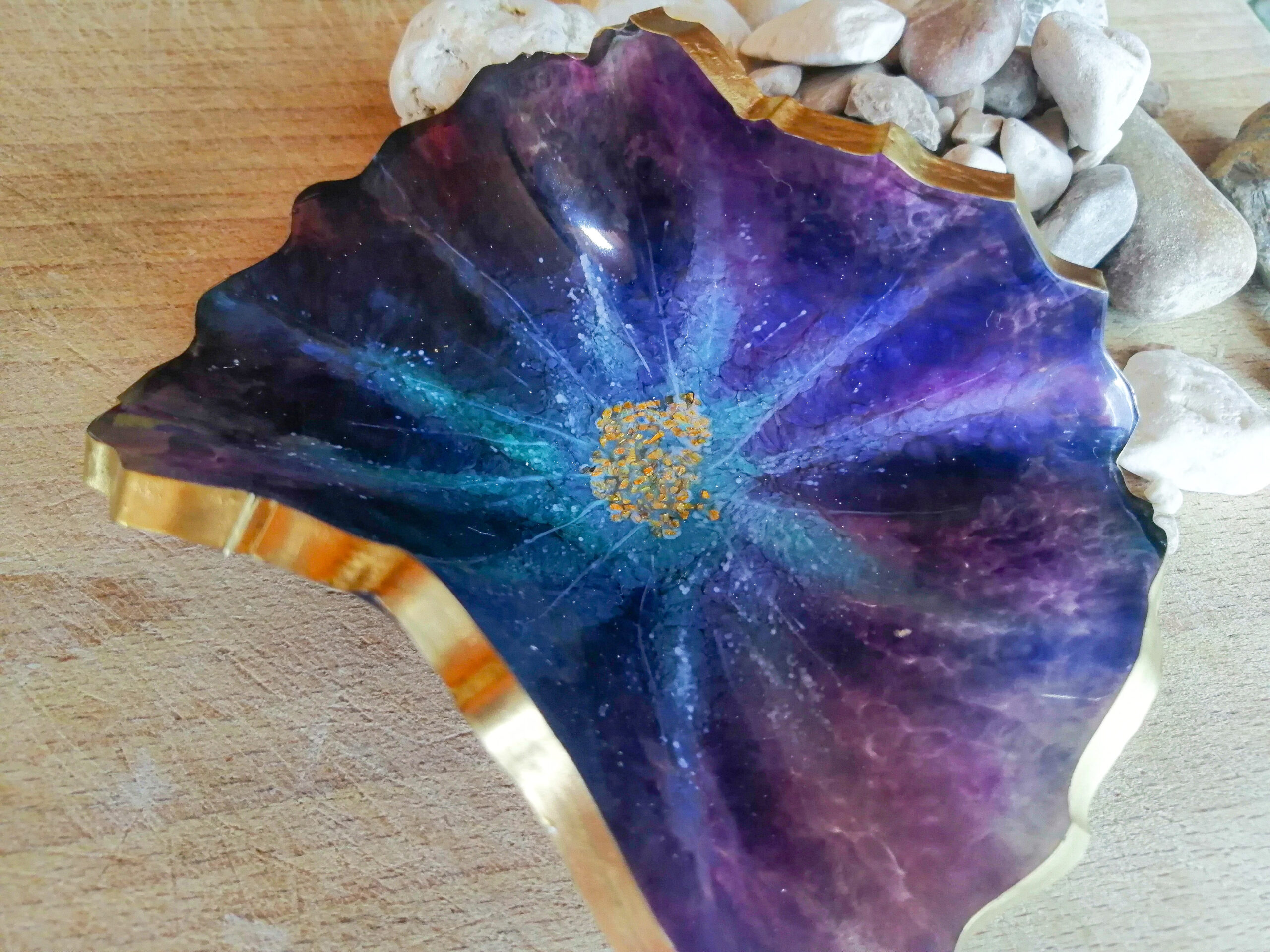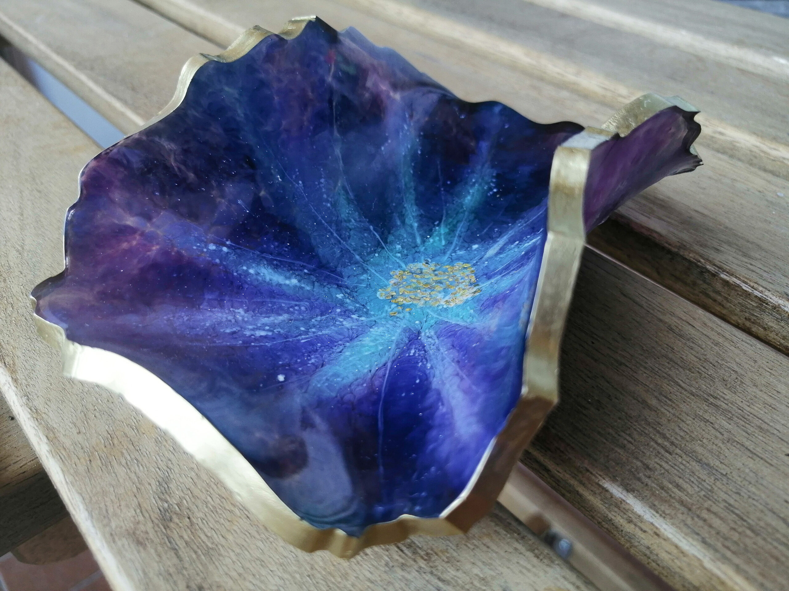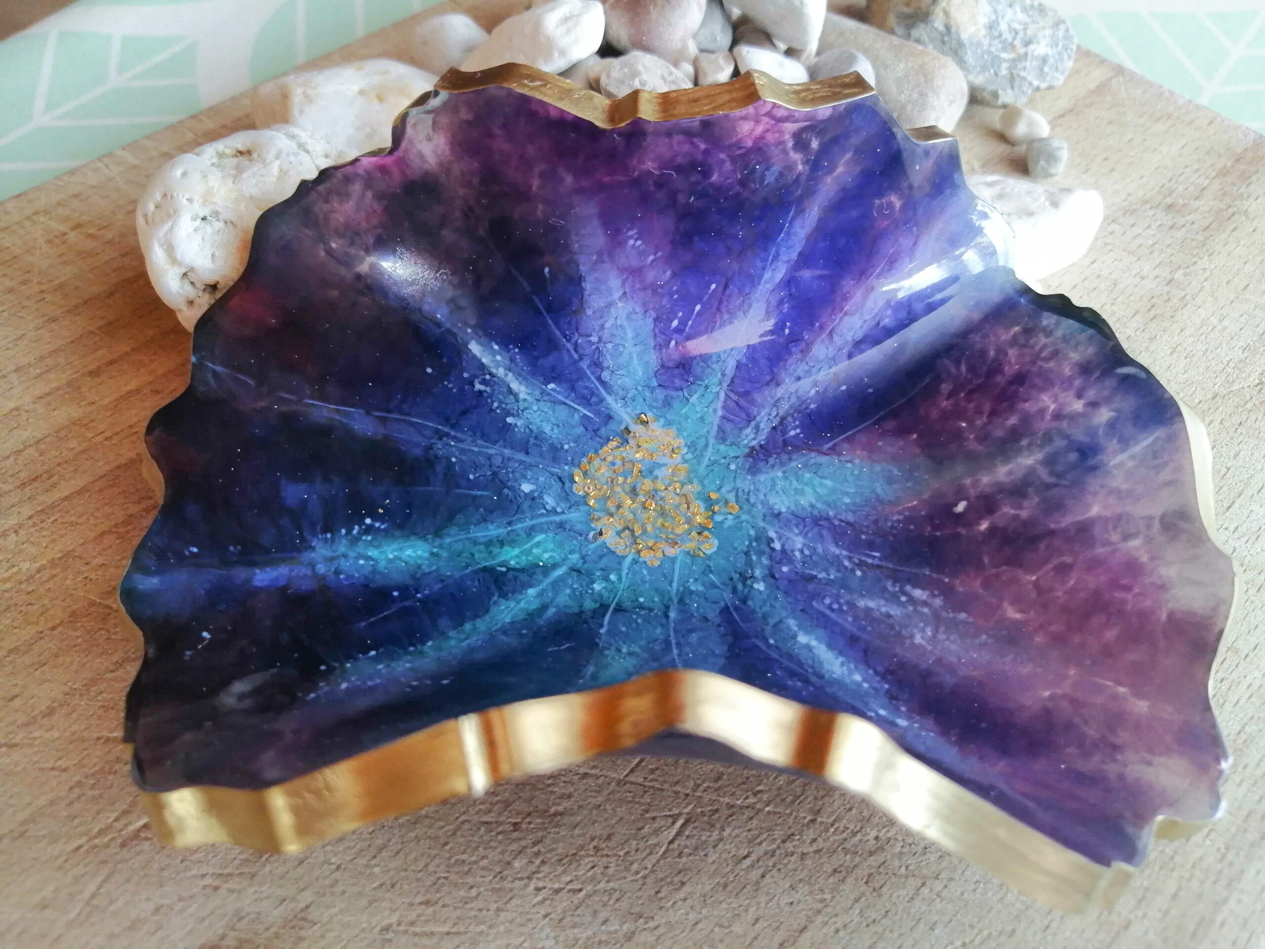 Zelo rada mešam modro in vijolično barvo v smoli, saj je rezultat vedno osupljiv. Tokrat vam predstavljam to fantastično posodo iz smole nepravilne oblike. Majhna skleda je kot nalašč za shranjevanje nakita, potpourija, kovancev, ključev, denarja, sladkarij ali karkoli želite. Unikatna umetnina za vašo dnevno sobo, kuhinjo, kopalnico ali spalnico.