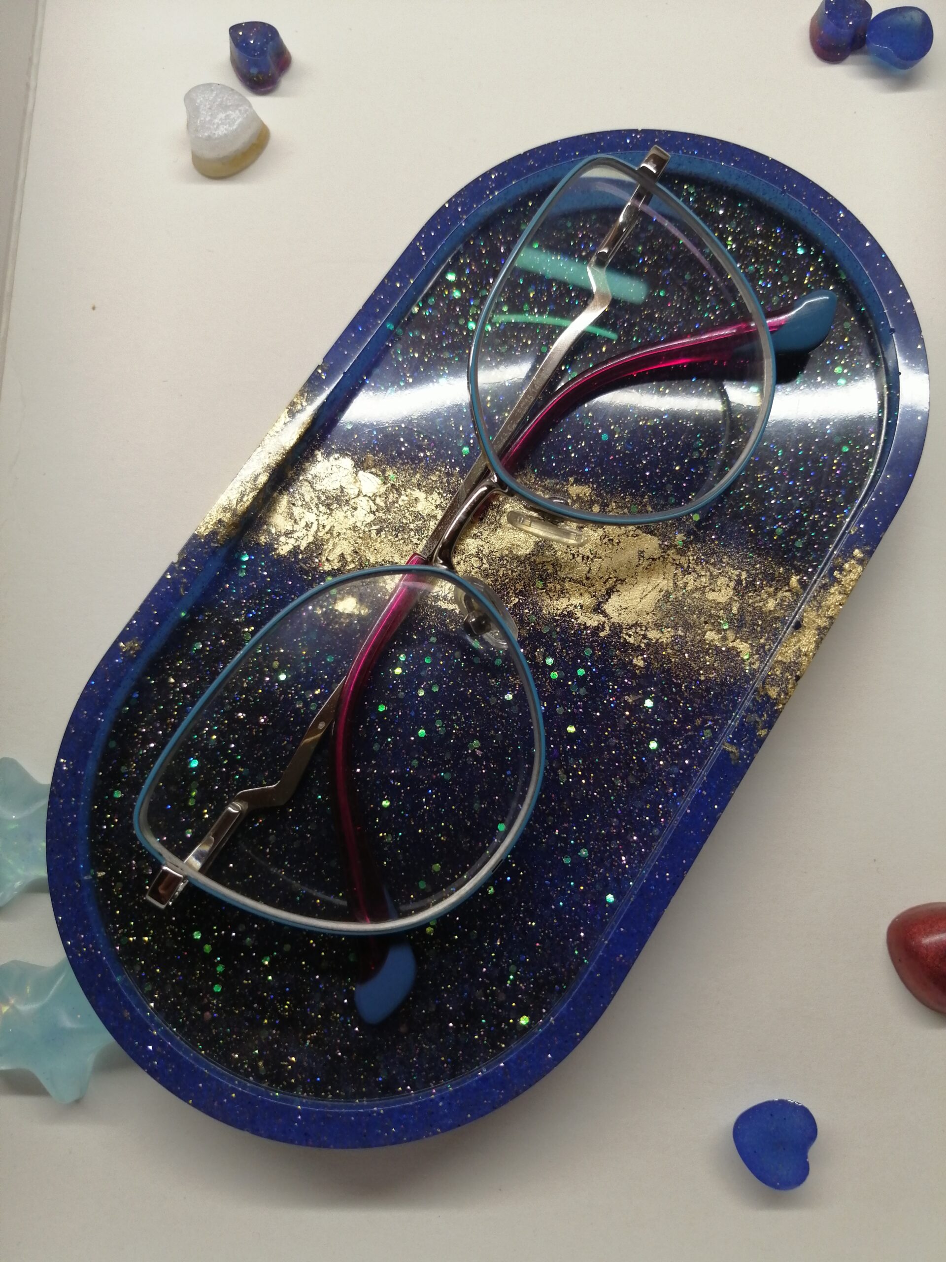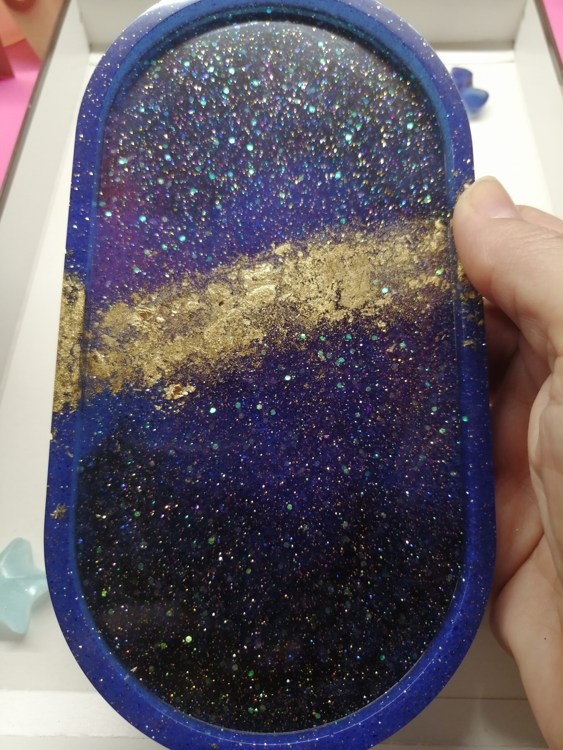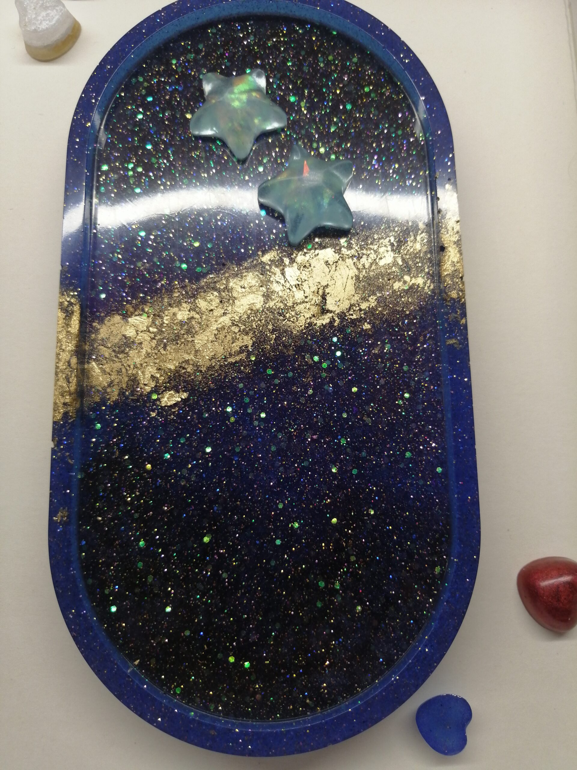 Čudovit in unikaten ročno izdelan pladenj, ki ga je navdihnila galaksija, je kot nalašč za shranjevanje nakita, kovancev, ključev, denarja, bonbonov ali karkoli želite. Izdelan iz visokokakovostne kristalno čiste smole za živila, je edinstvena umetnina za vašo dnevno sobo, kuhinjo, kopalnico, spalnico ali pisarno.