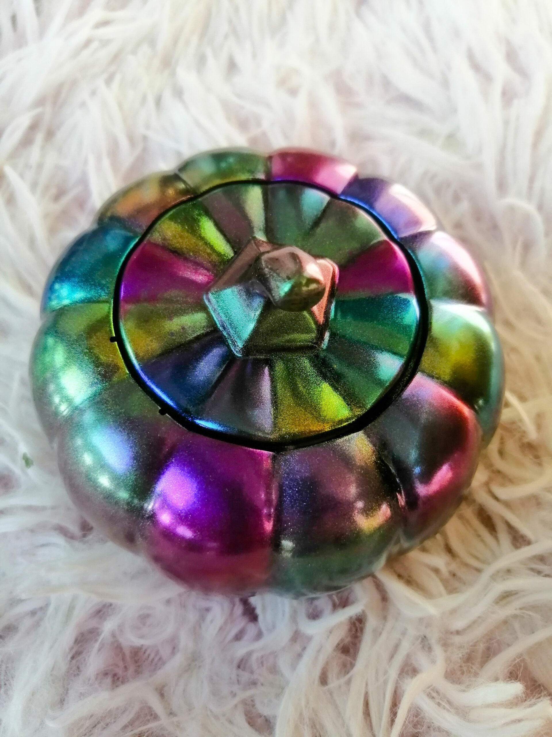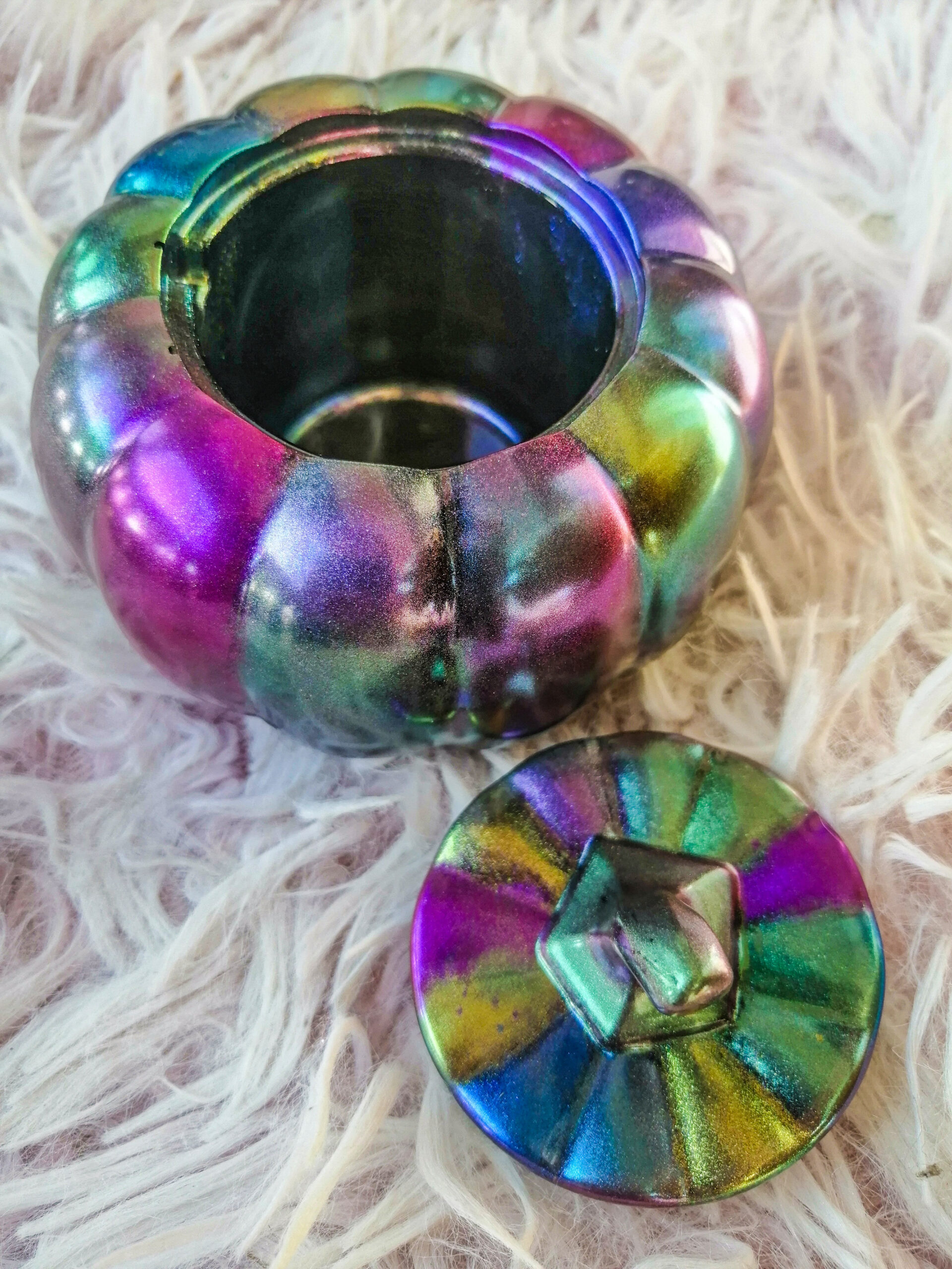 Če iščete popolno darilo za noč čarovnic, ne iščite več!!! Ta sijoča večbarvna posodica v obliki buče s pokrovom je PRAVA IZBIRA!