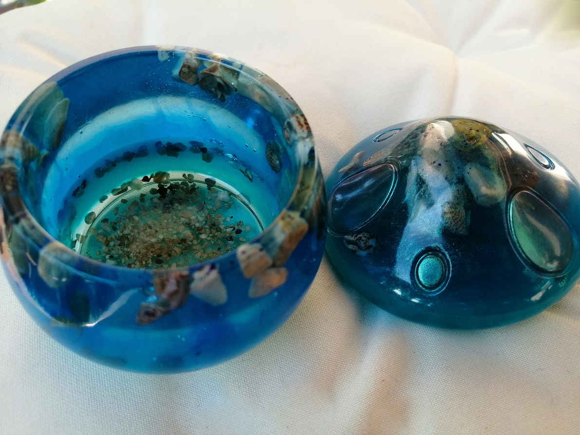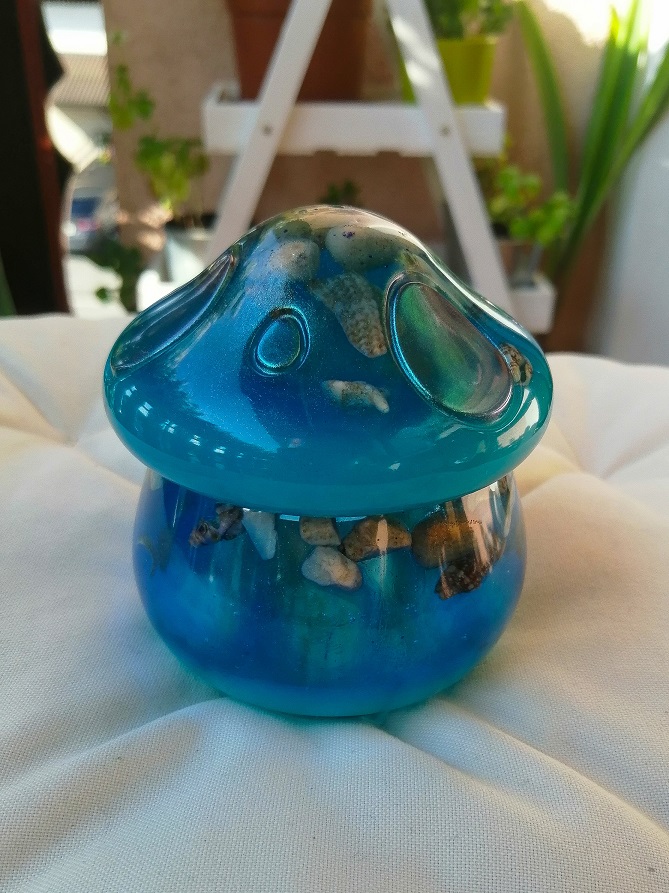 Unikatna, ročno izdelana posoda v obliki gobe, s pokrovom, čudovite modre barve je narejena iz epoksi smole, naravnih školjk, mivke, kamnov in alkoholnega črnila.