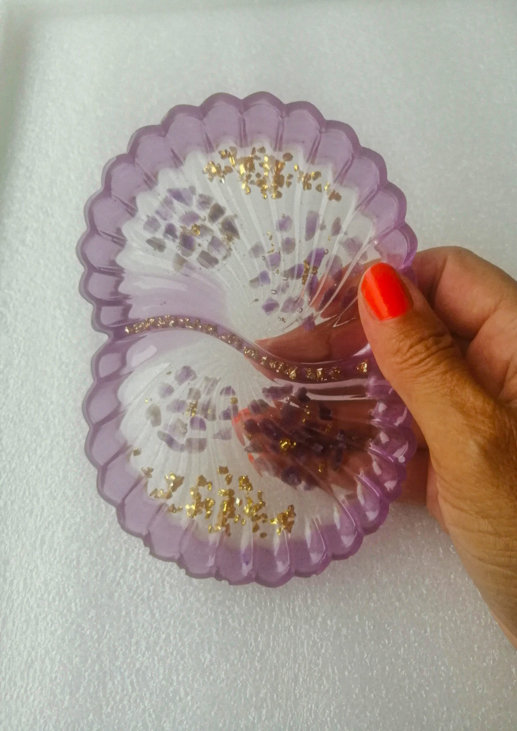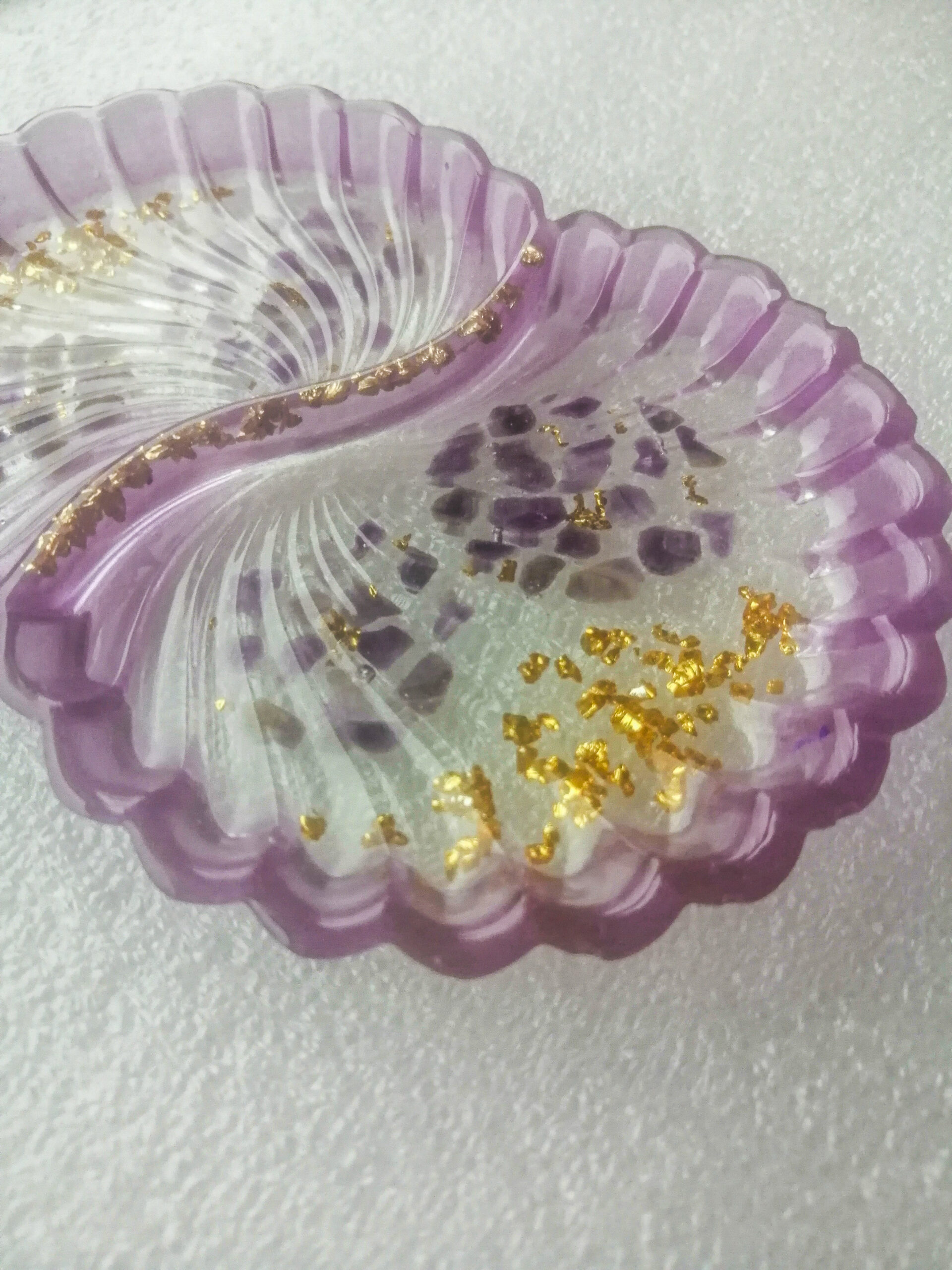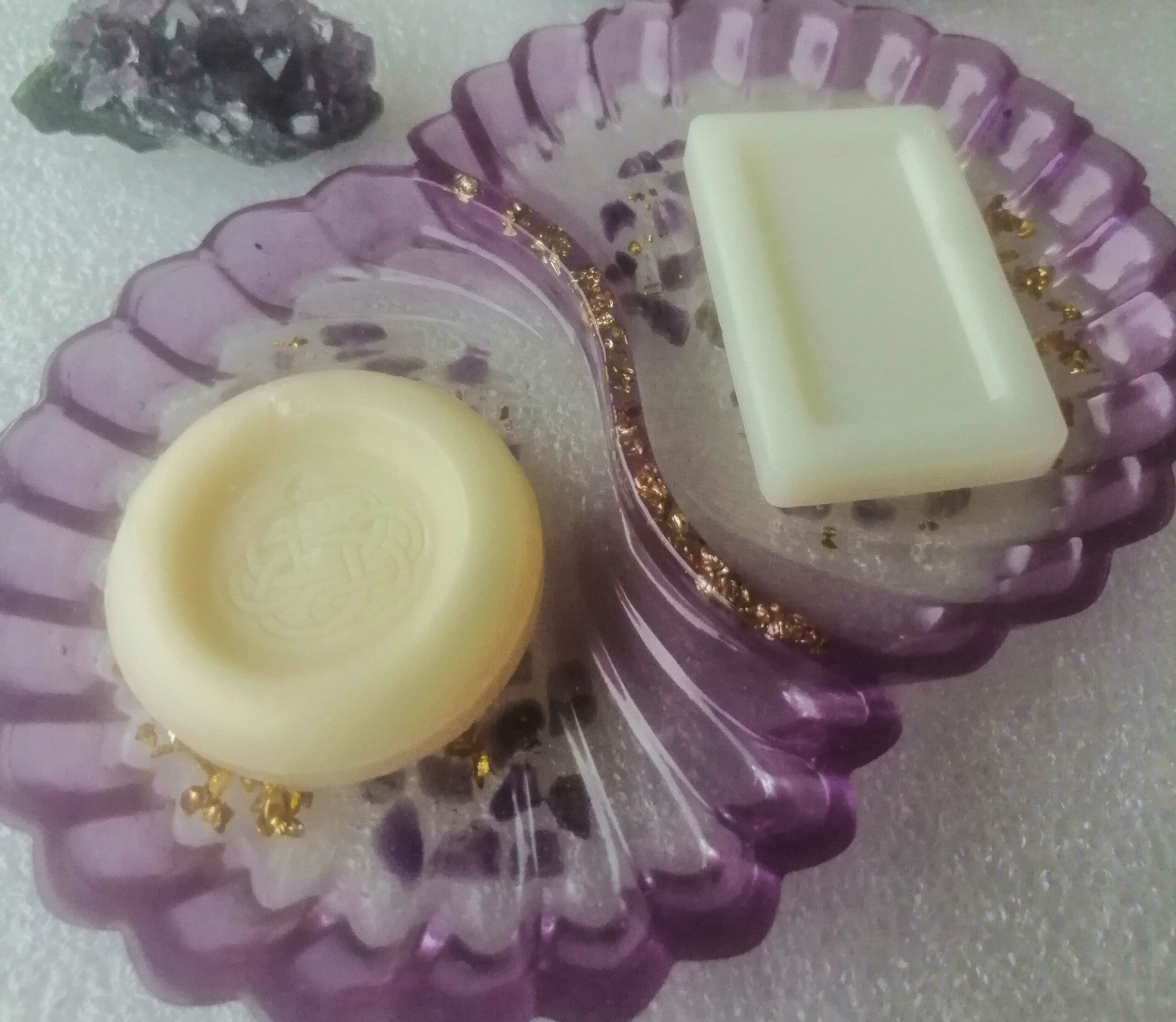 Je 100 % ročno izdelana iz visokokakovostne epoksidne smole, naravnih pigmentov, zlatih kosmičev in drobcev naravnega ametista. Zasnovana je kot eleganten podstavek za milo za vašo kopalnico, lahko pa jo uporabite tudi kot držalo za nakit ali za shranjevanje česar koli želite. Možnosti so neskončne!