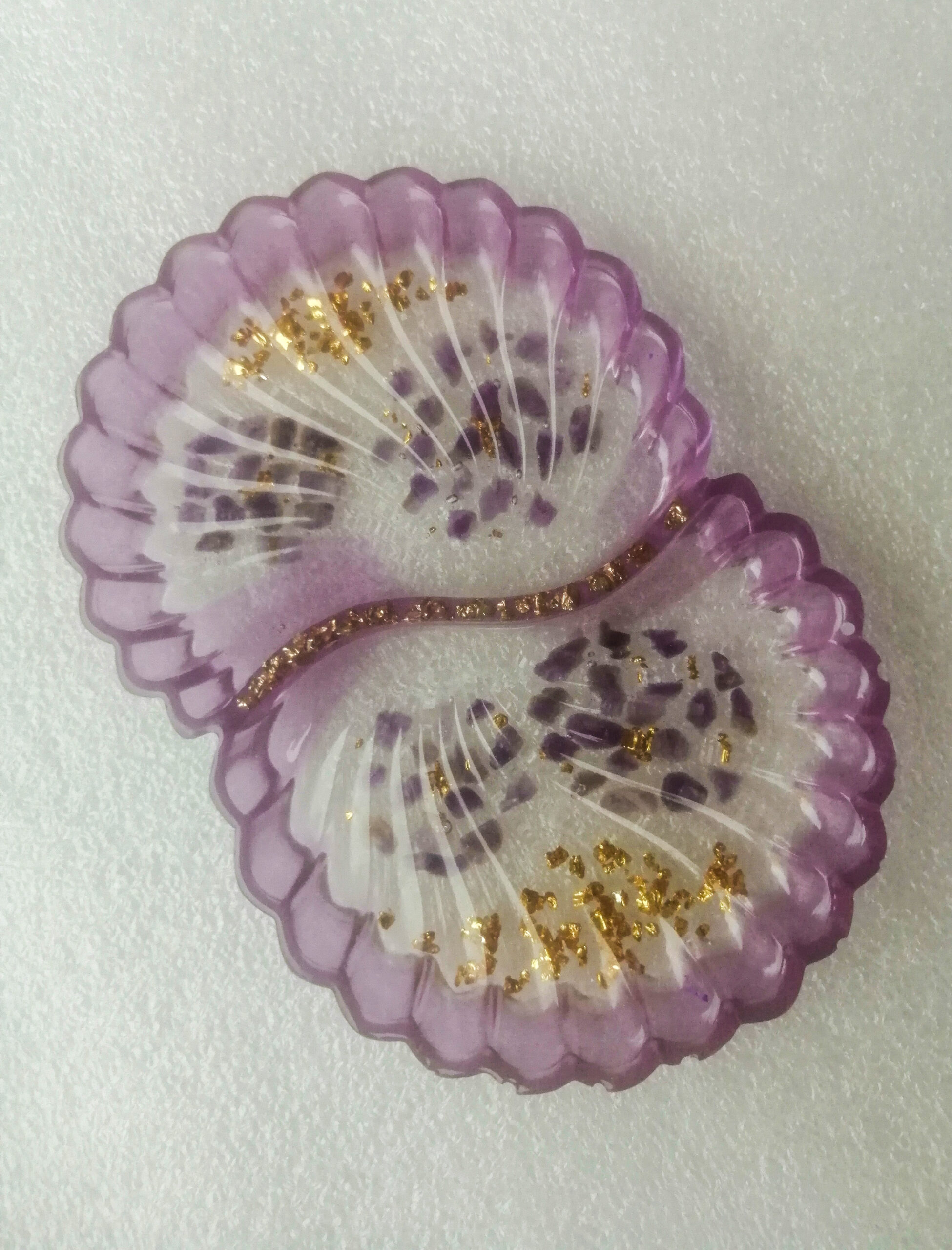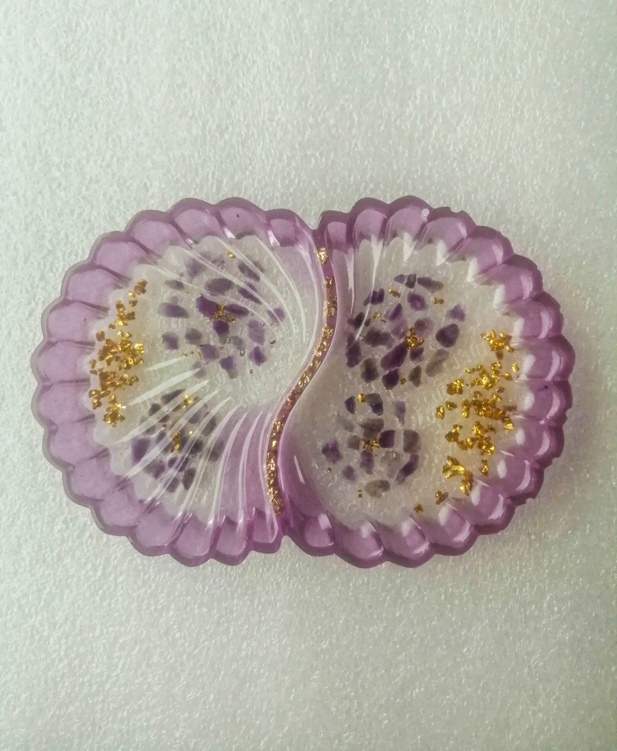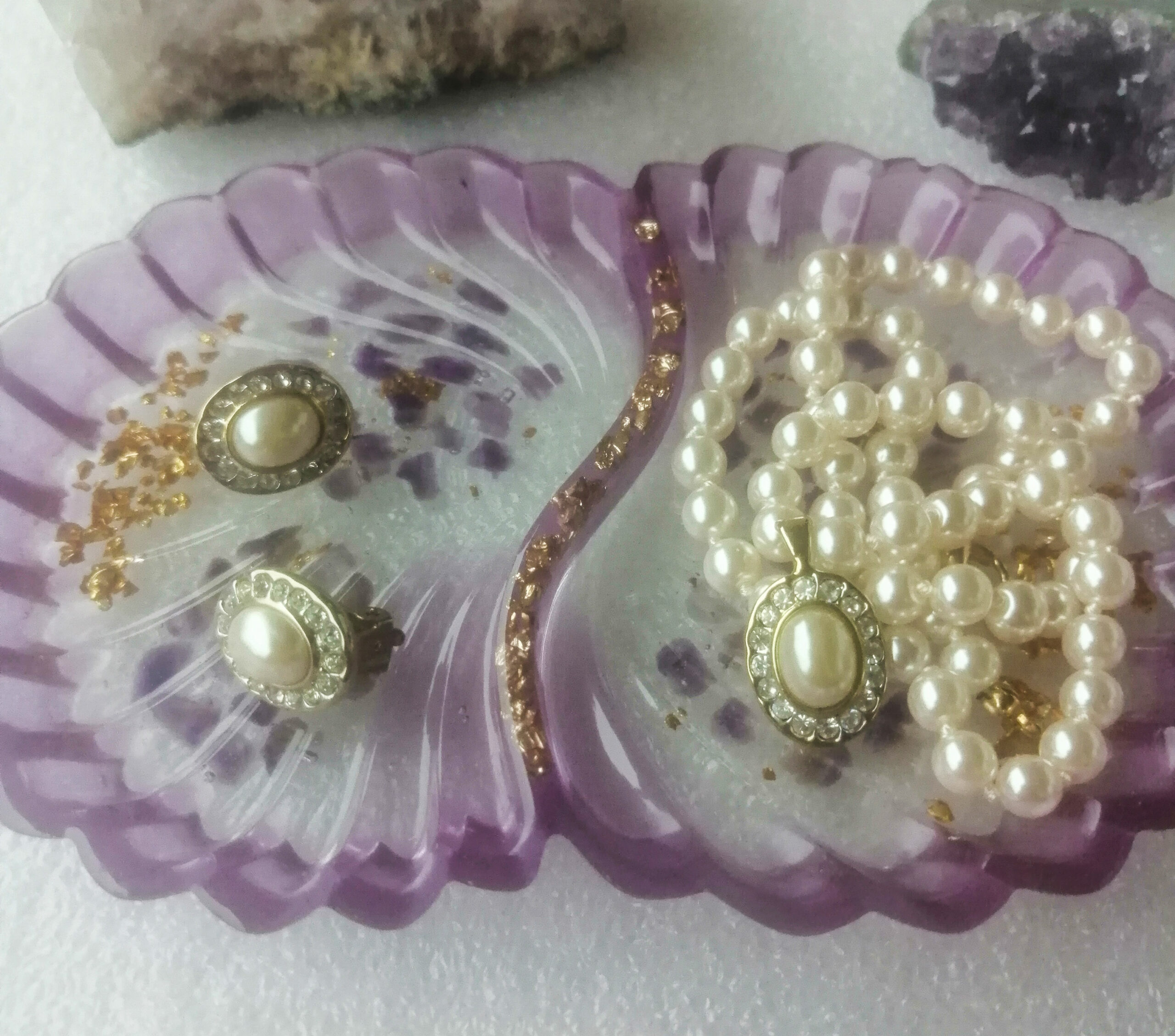 Je 100 % ročno izdelana iz visokokakovostne epoksidne smole, naravnih pigmentov, zlatih kosmičev in drobcev naravnega ametista. Zasnovana je kot eleganten podstavek za milo za vašo kopalnico, lahko pa jo uporabite tudi kot držalo za nakit ali za shranjevanje česar koli želite. Možnosti so neskončne!