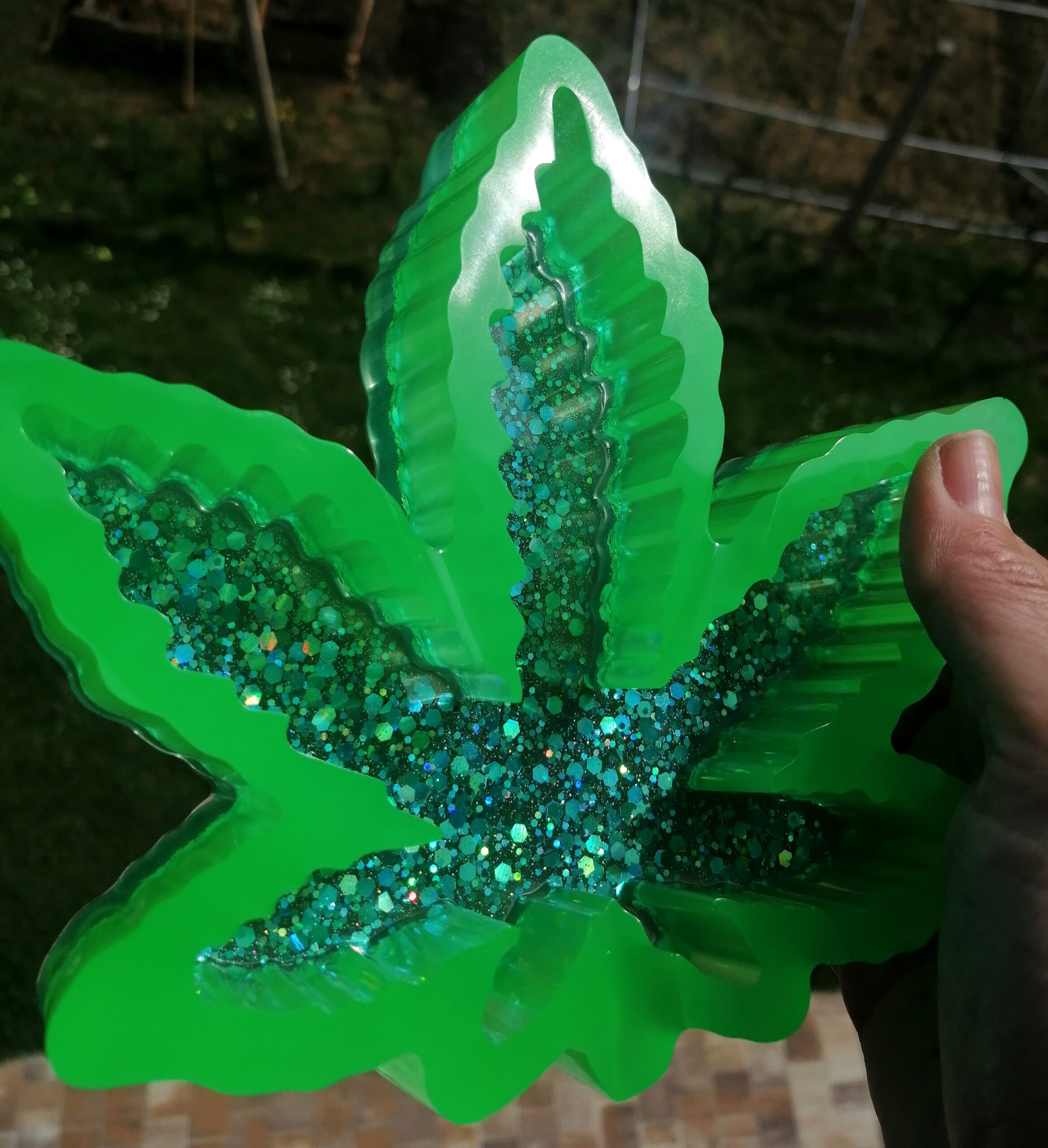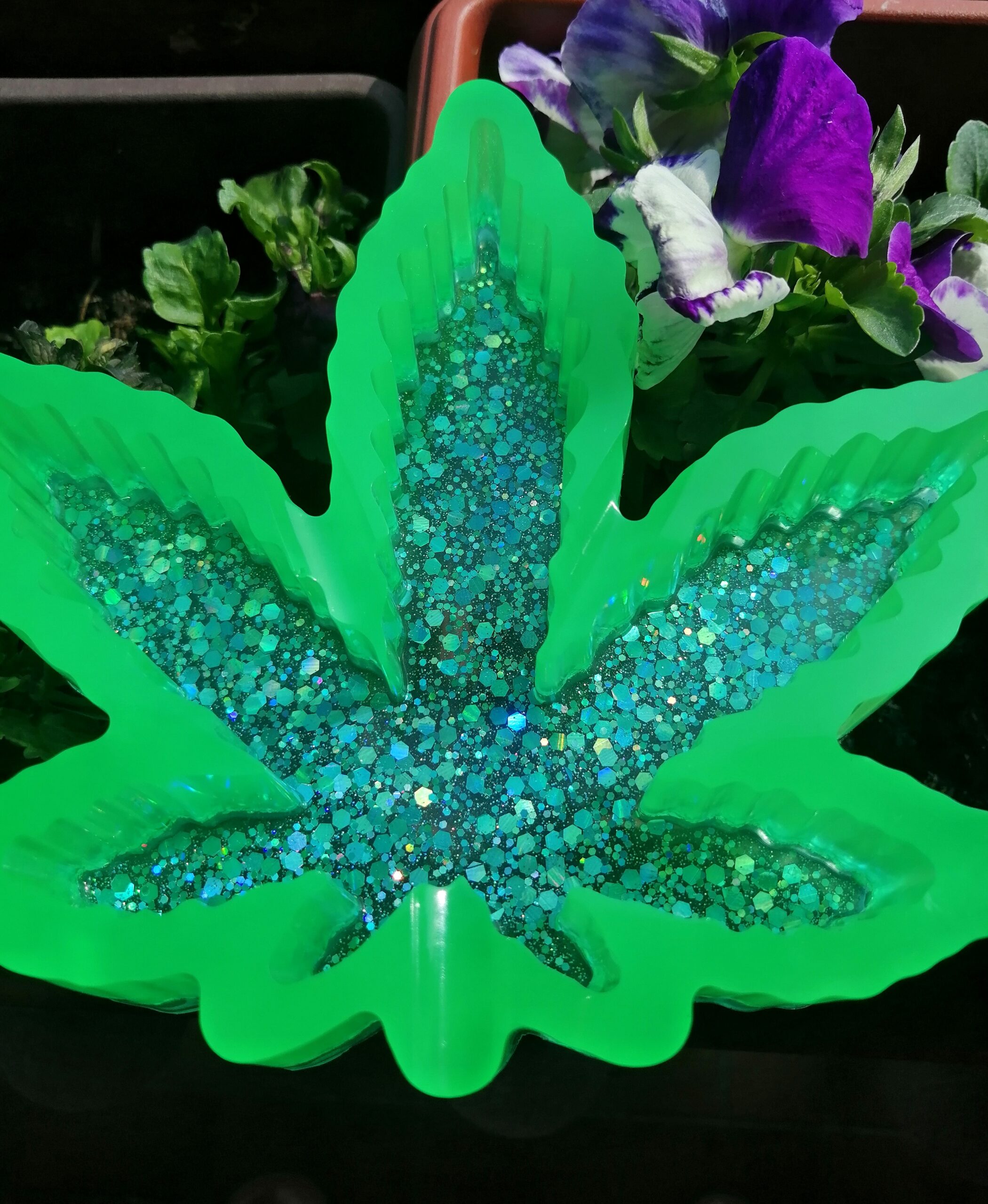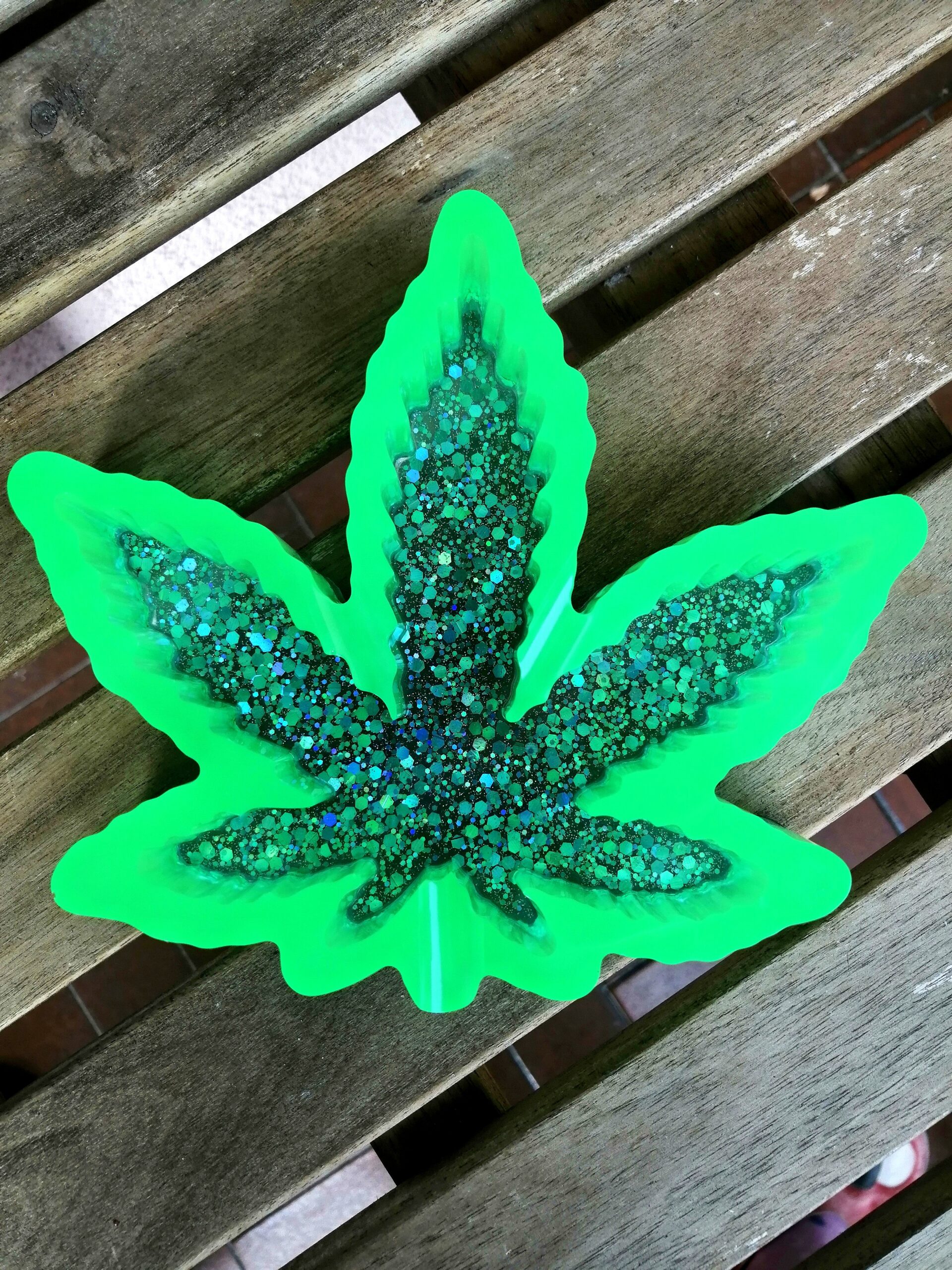 Tole je po meri izdelan pepelnik iz smole. Tisti na sliki, kateri ni več na voljo, je zeleno obarvan z mavrično modrimi bleščicami in zelenim obrobom, ki se sveti v temi. Na seznamu izberite katero koli barvno shemo in bleščice ali barve ki se svetijo v temi. Prosim, da mi to sporočite prej ko dodate izdelek v košarico.