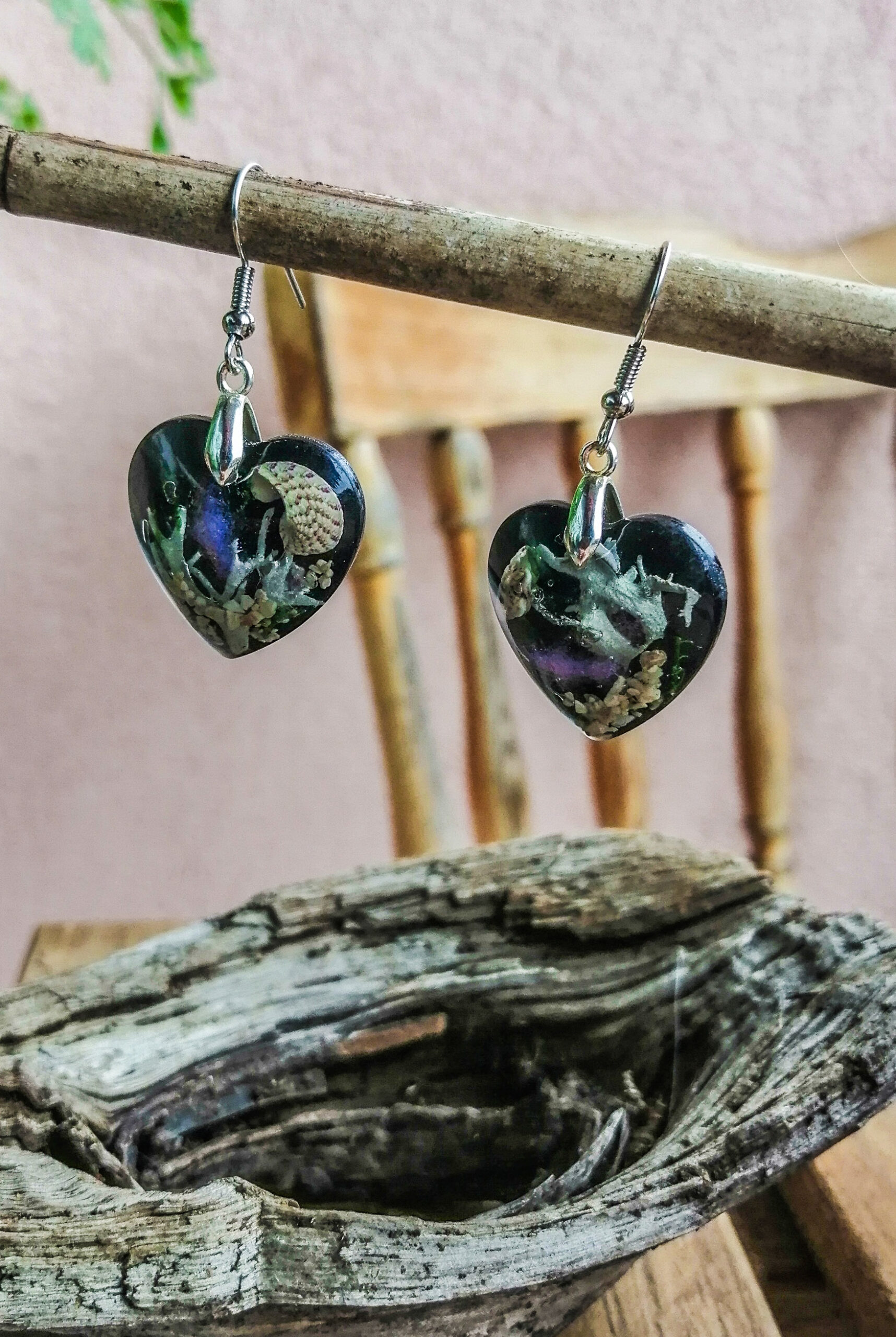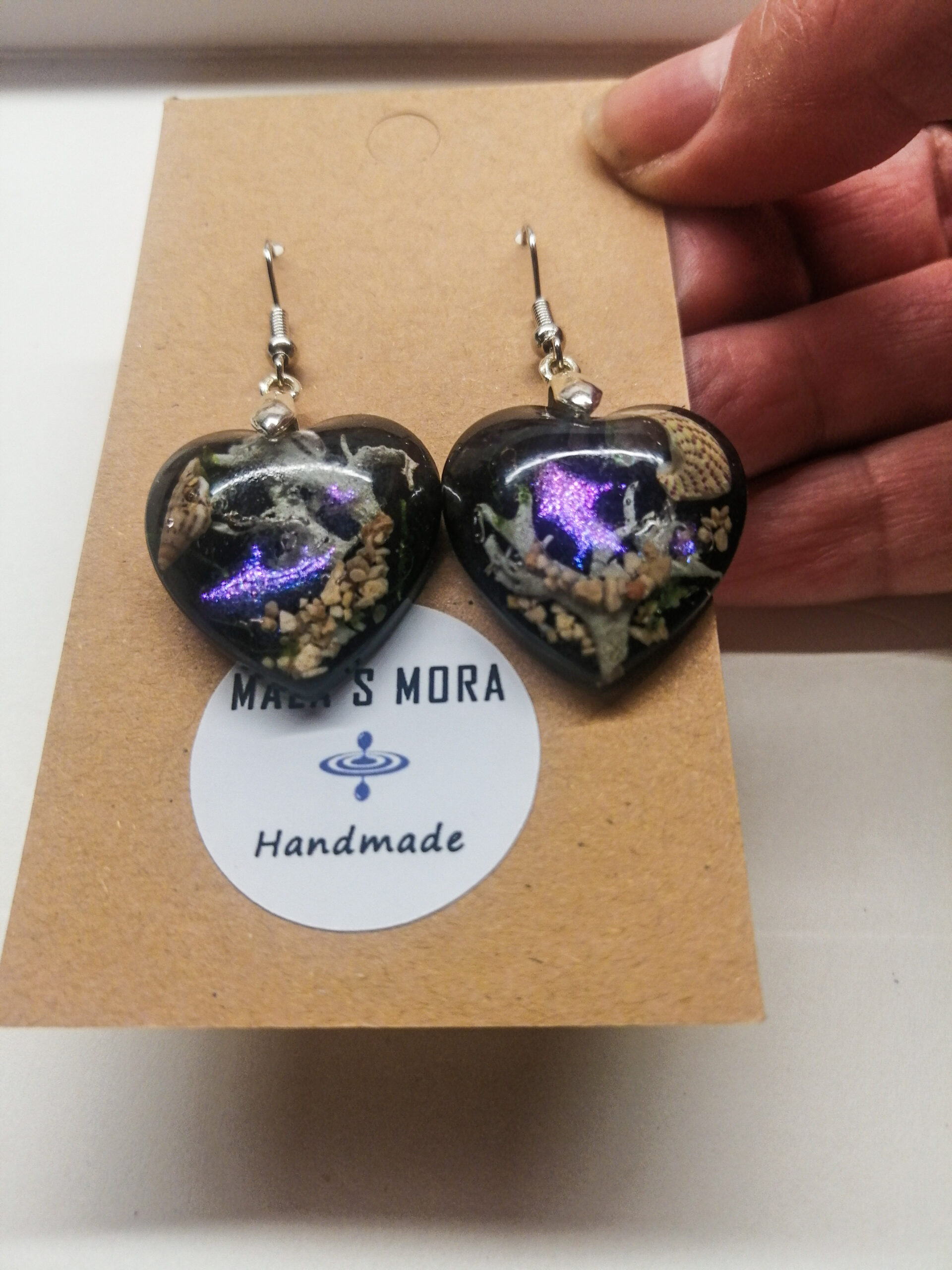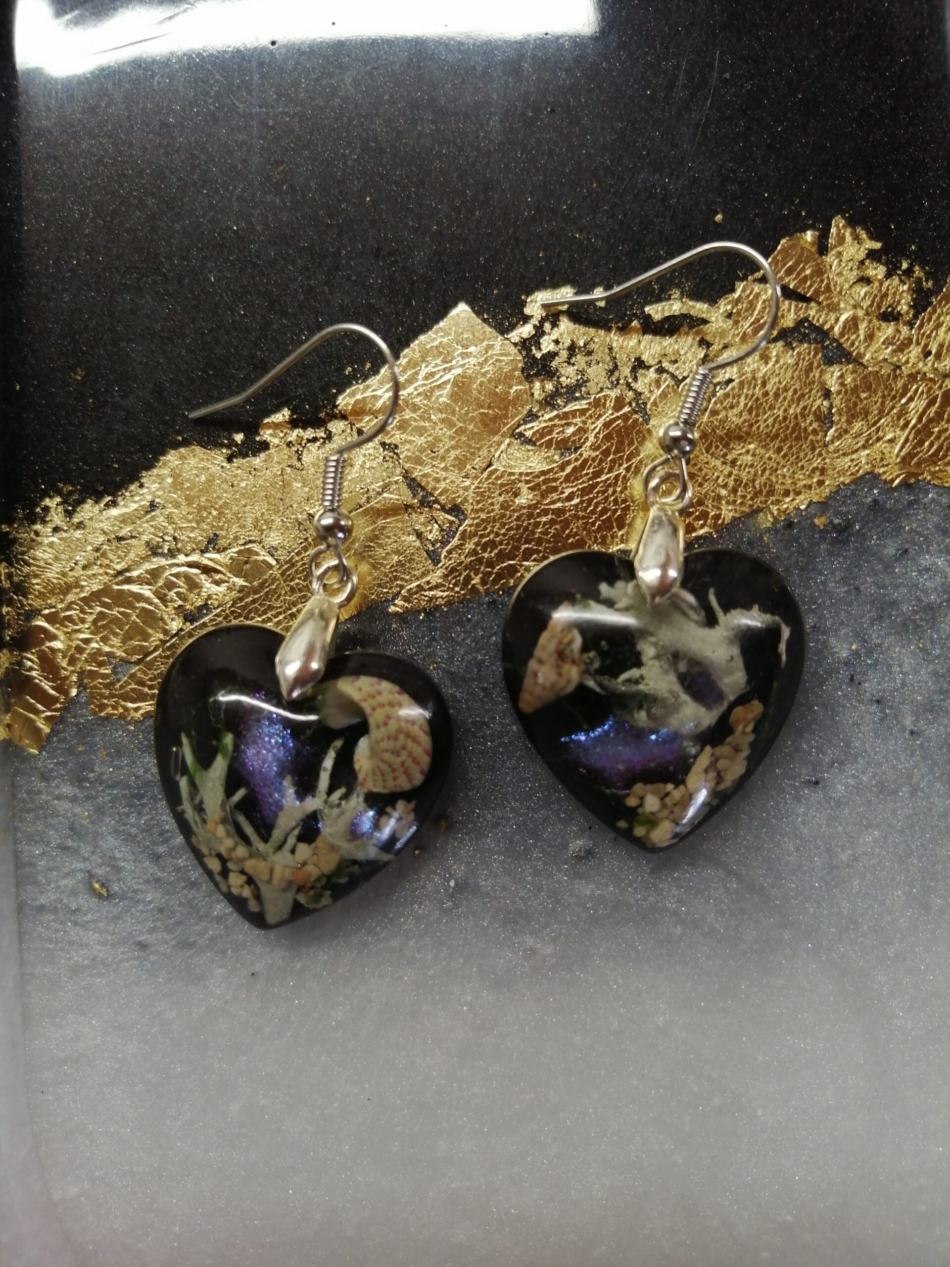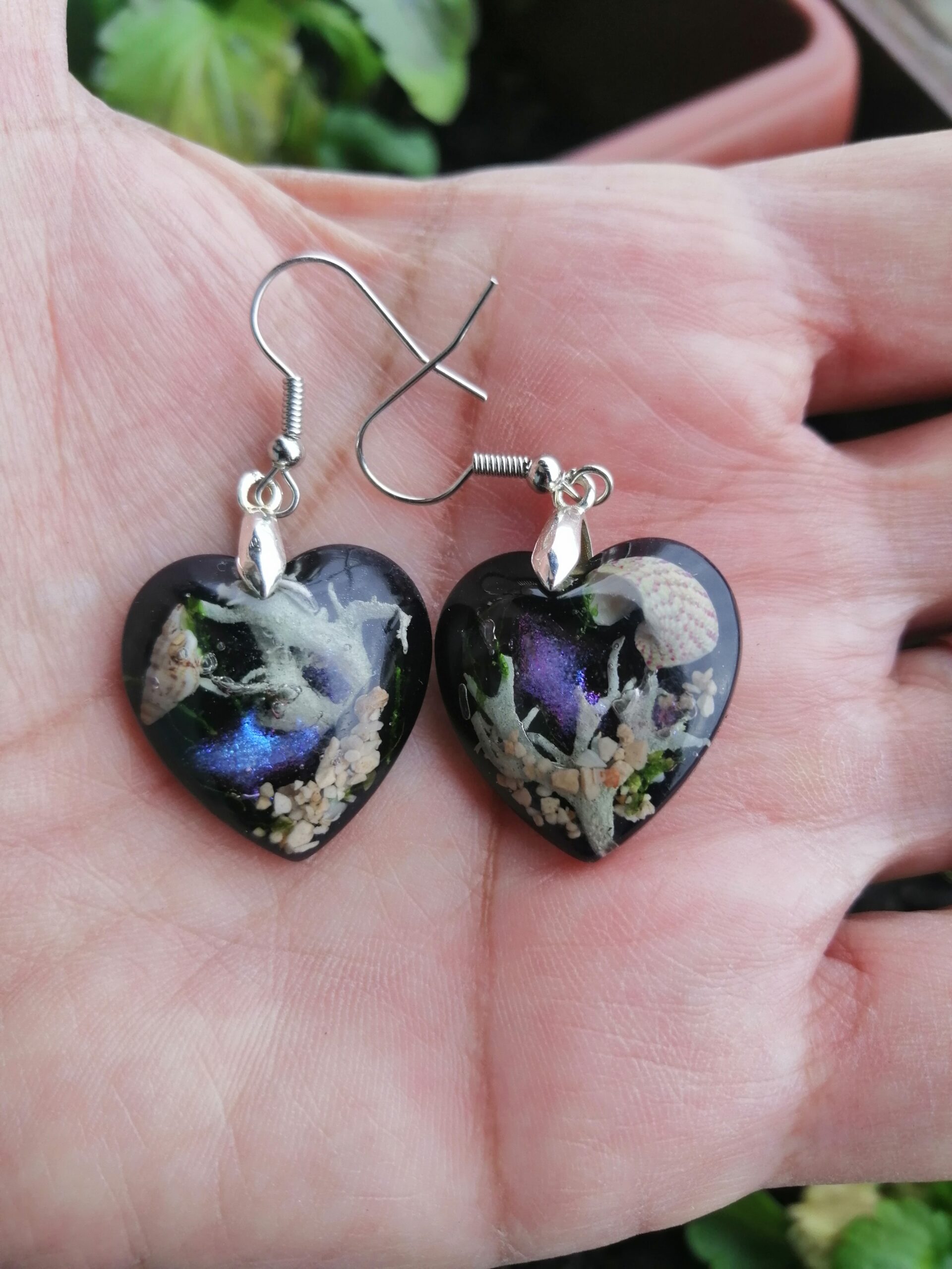 Če ste ljubitelj globokega morja, so to pravi uhani za vas! Med pravim morskim peskom, školjkami in rastlinami se skriva svetlikajoča riba. Ti uhani so prava mala mojstrovina, unikatni in zanimivi.