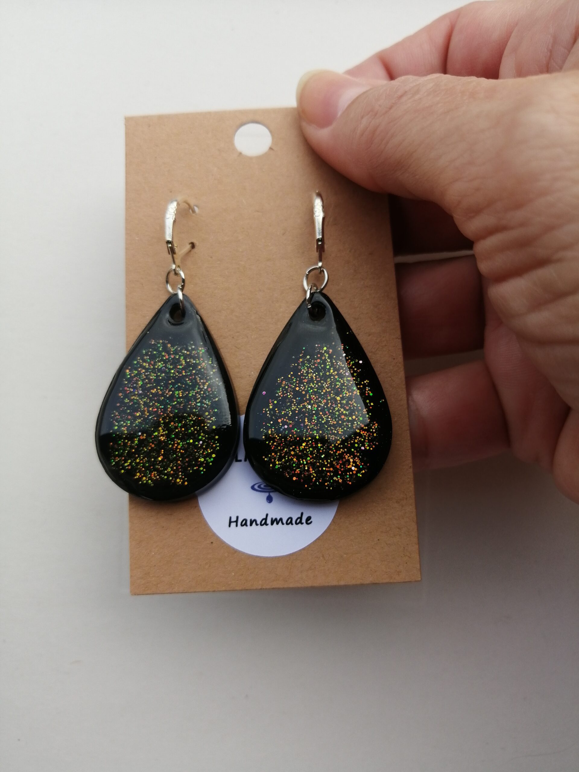 So lahki in bleščeči, narejeni iz prozorne epoksi smole, črnega pigmenta in bleščic.