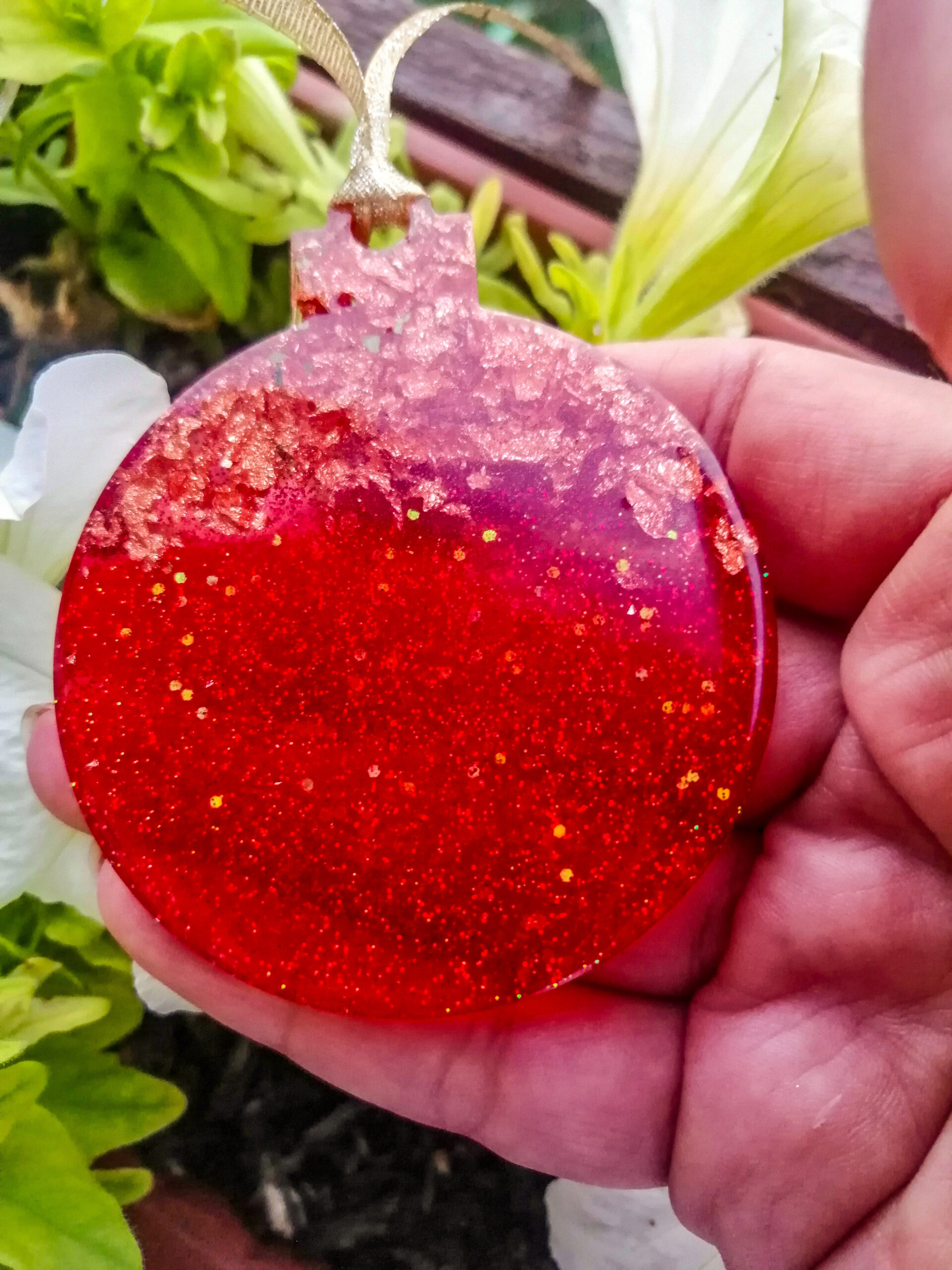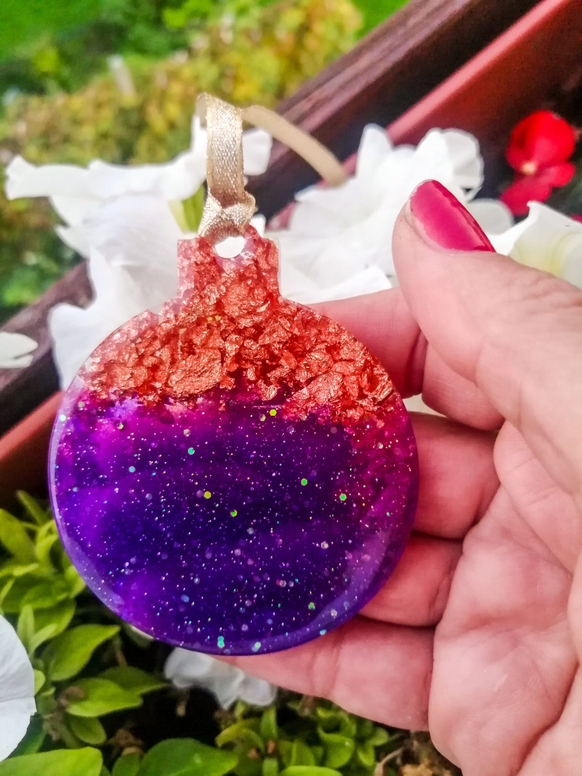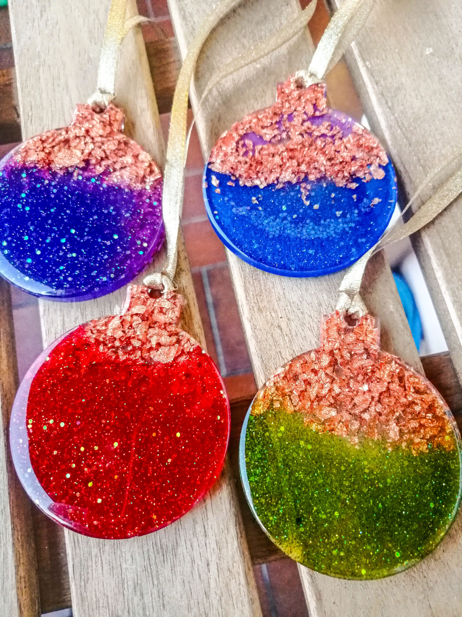 Te čudovite ročno izdelane božične okraske sem naredila iz kristalno jasne epoksi smole, bleščic, zlatih kosmičev in alkoholnega črnila. Vsako od njih sem skrbno pobrusila in zalila s več plasti smole. Popolne so za popestritev Božičnega uzdušja.