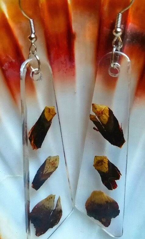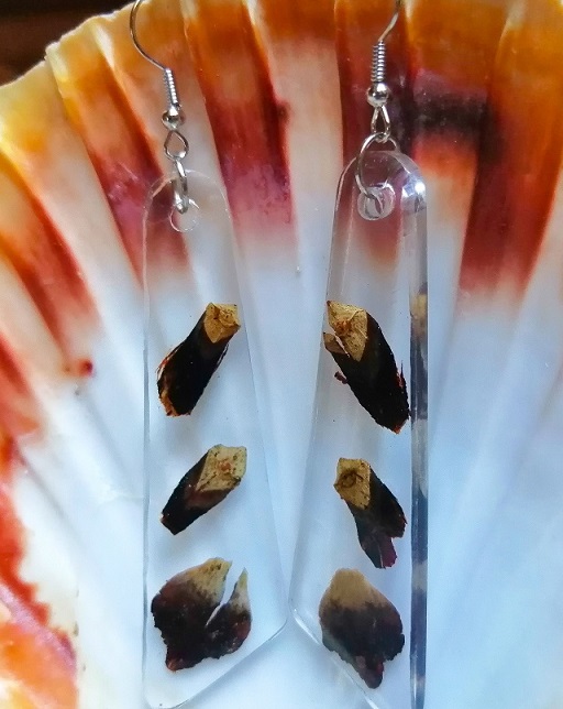 Ročno izdelani uhani iz prozorne epoksi smole in pravih posušenih borovih storžev, ki jih naberem v bližnjem gozdu. Sem jih posušila in ohranila v več plasteh smole.