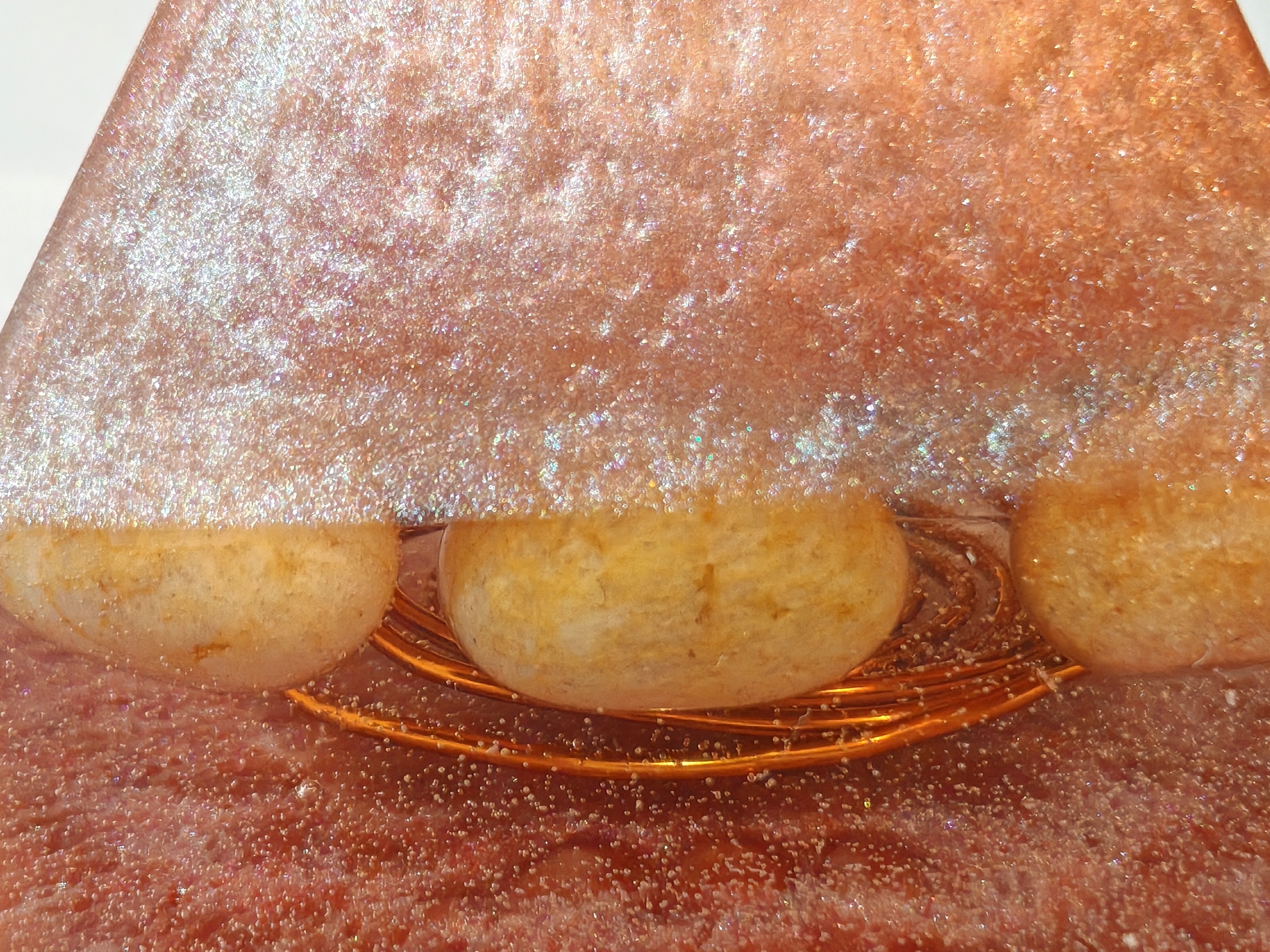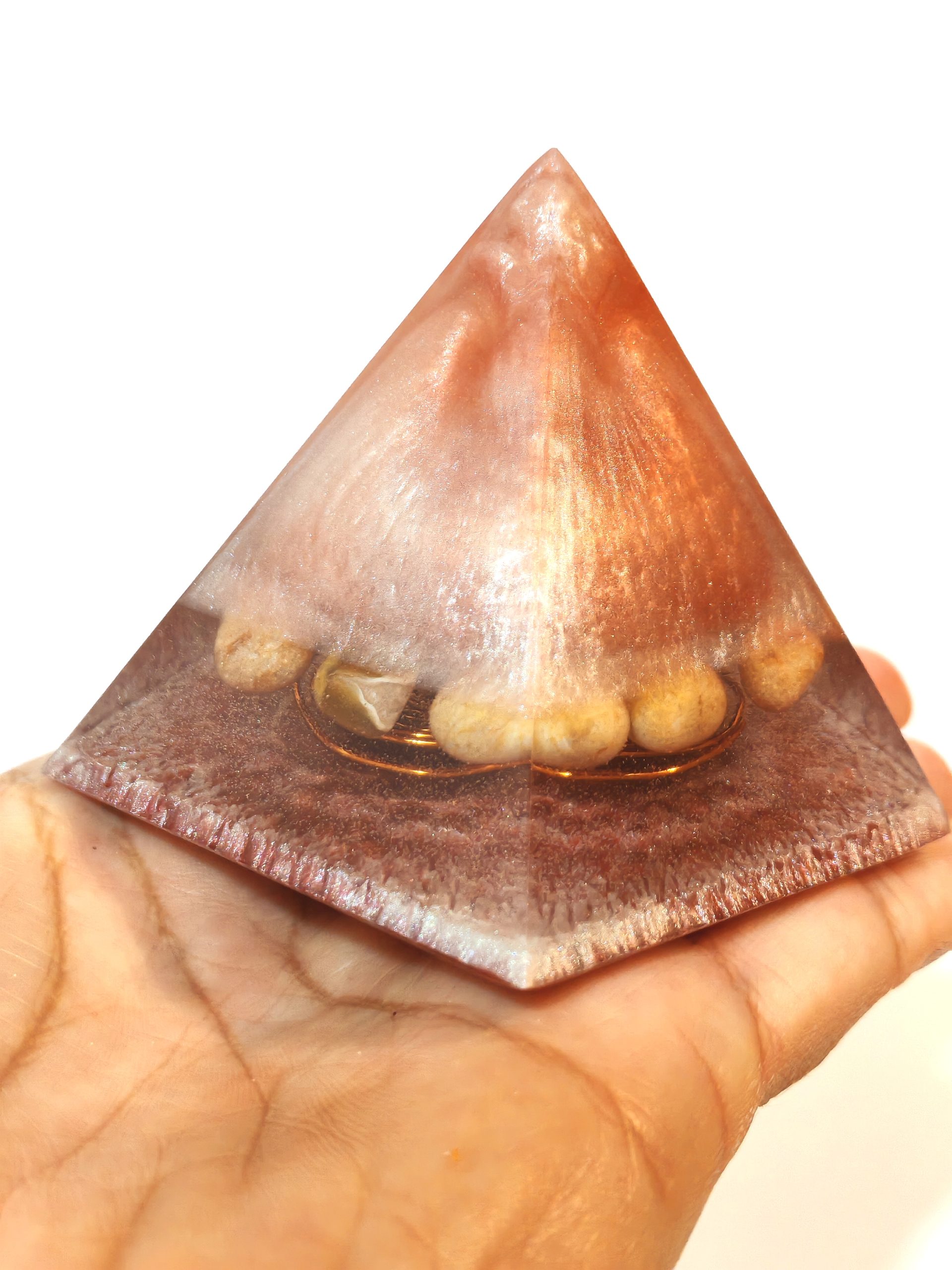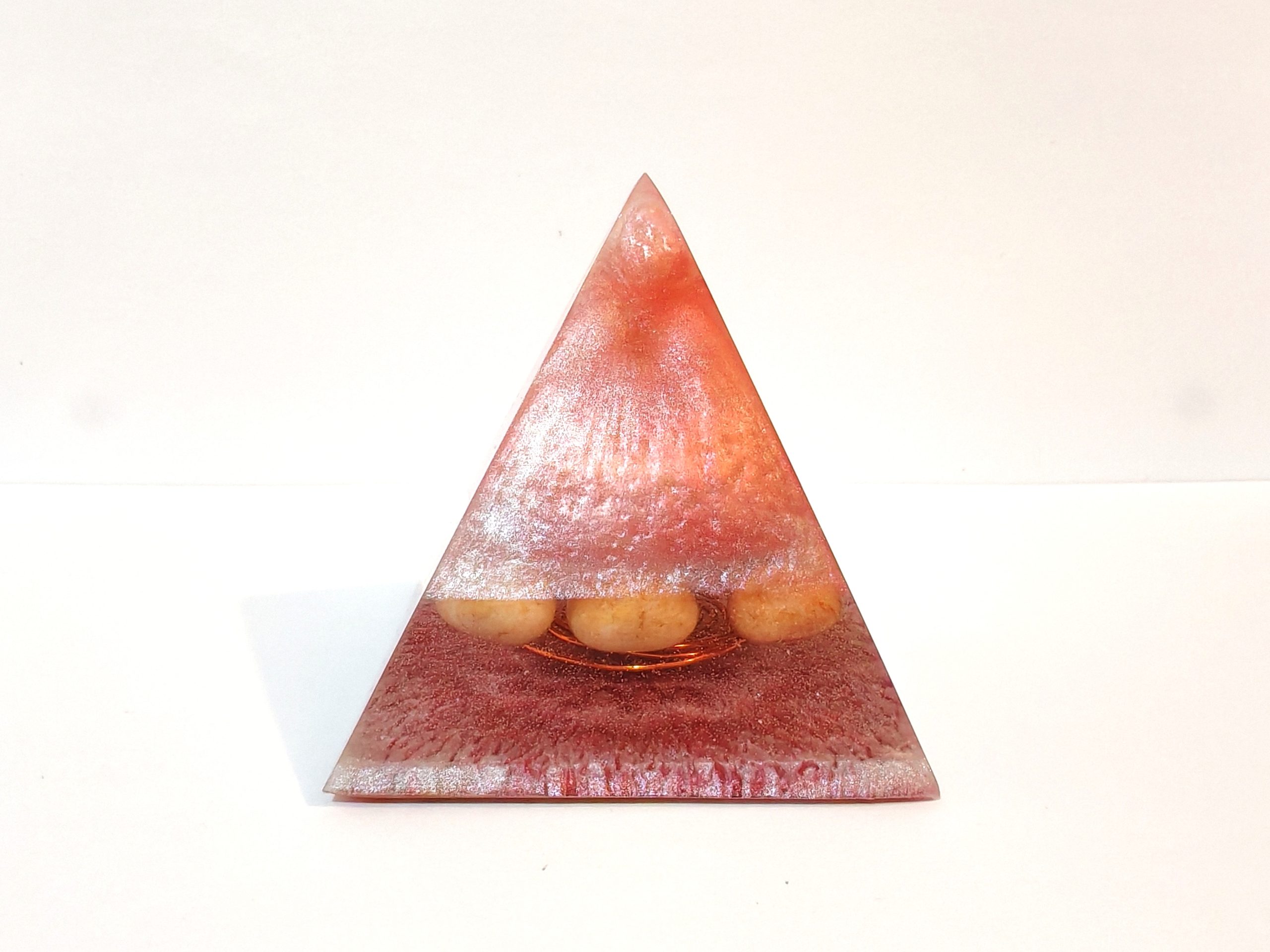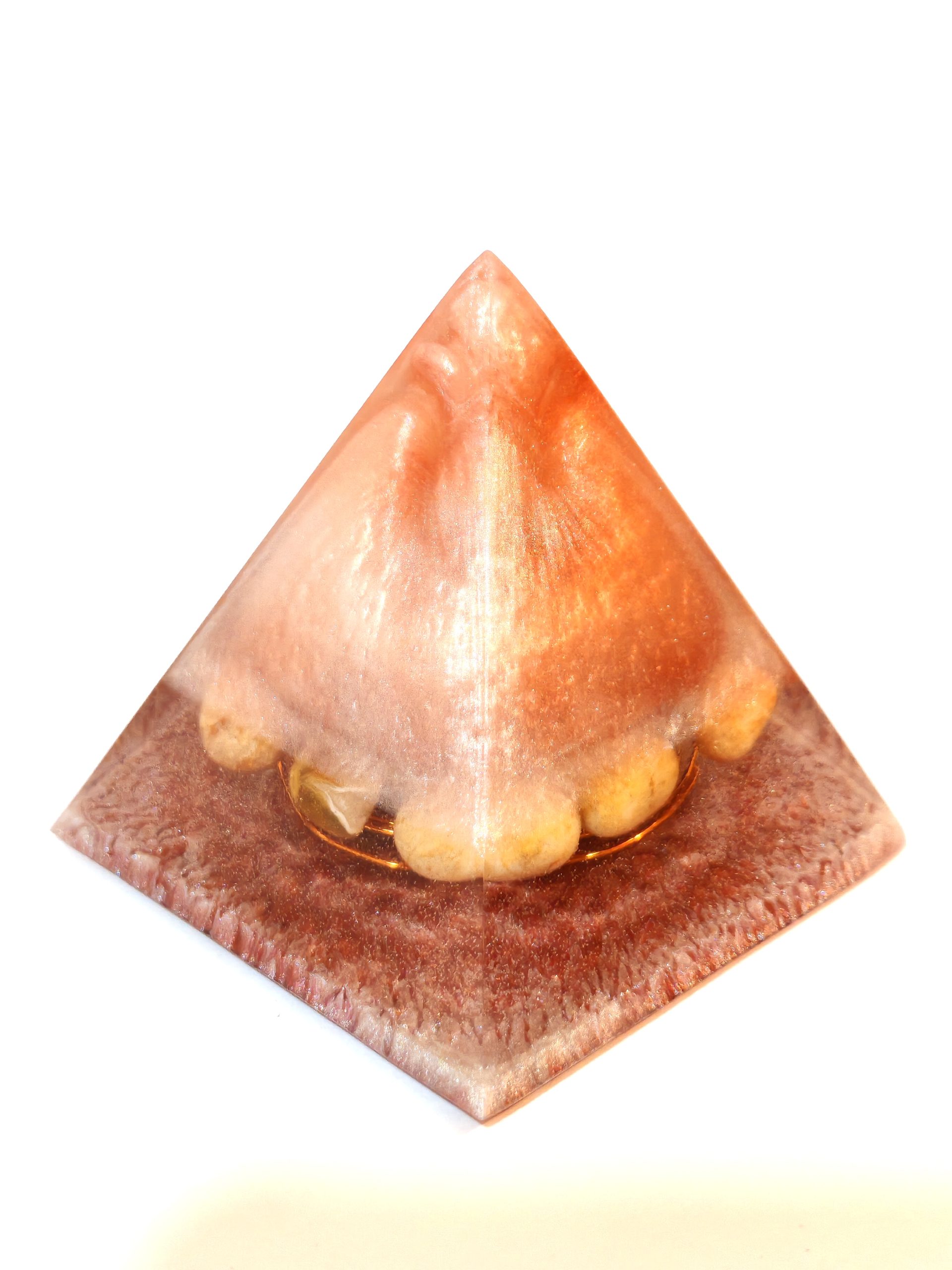 Ročno izdelana piramida iz smole v orgonitskem slogu z bakreno spiralo in naravnimi jaspisovimi kamni.