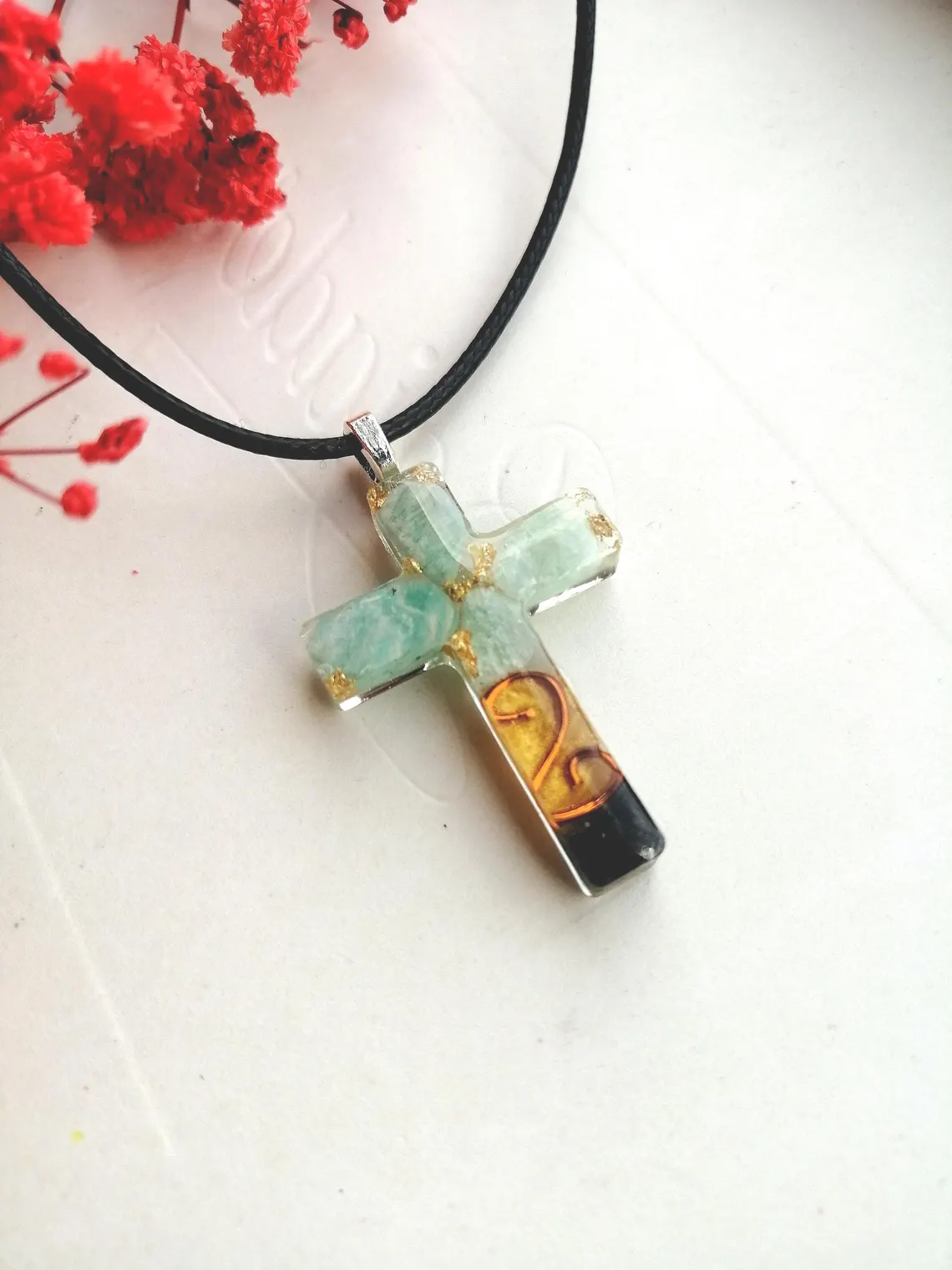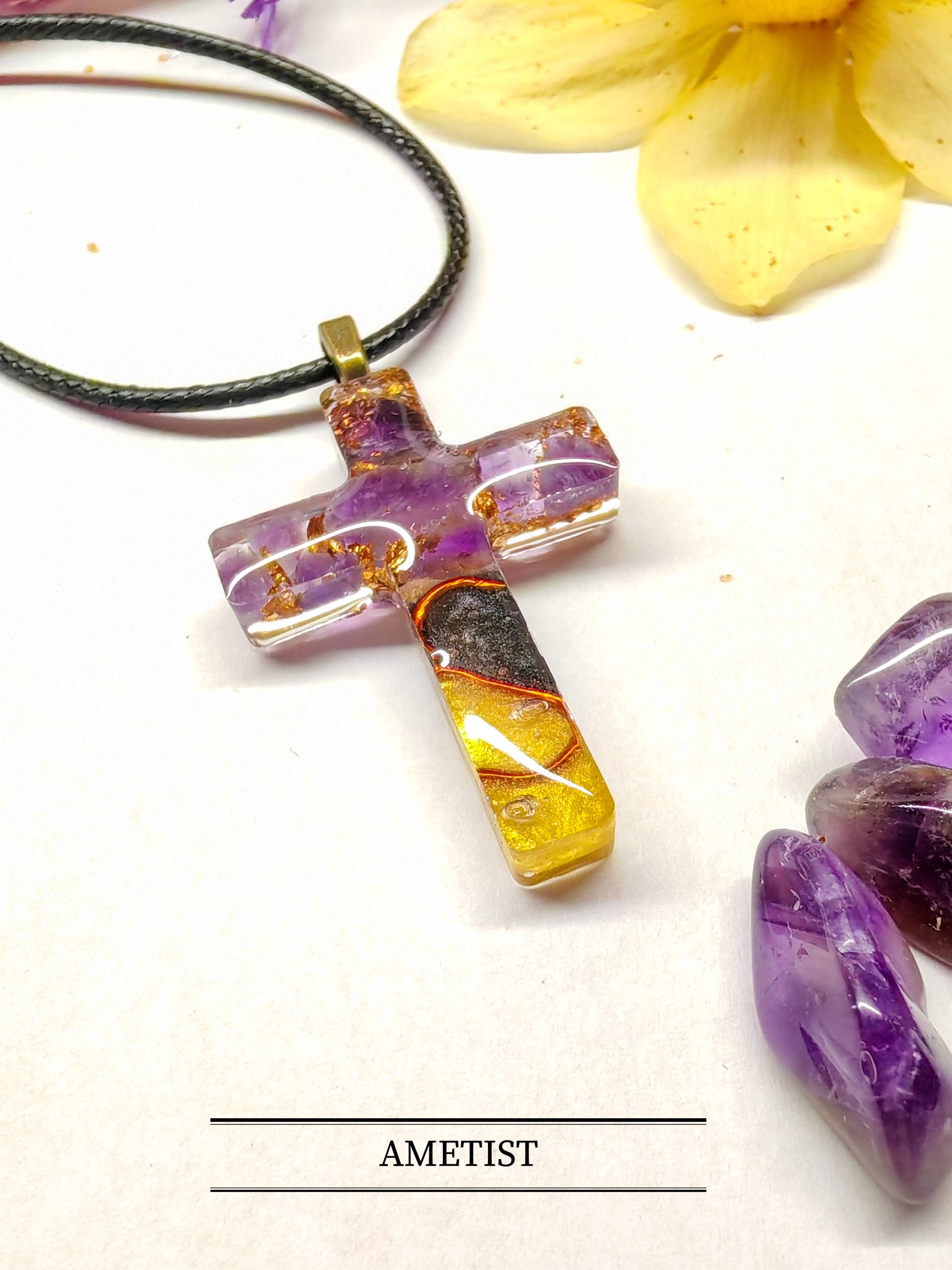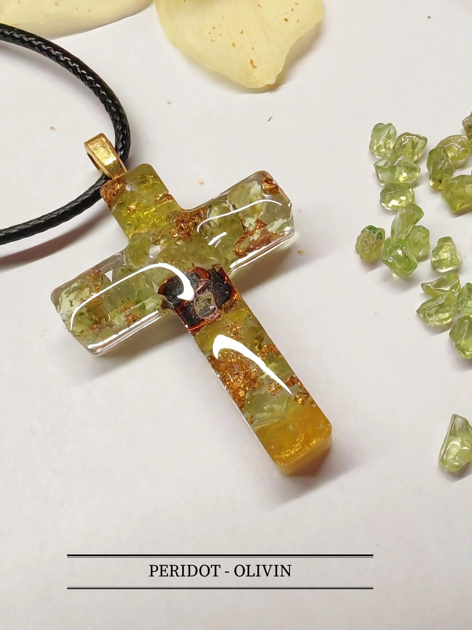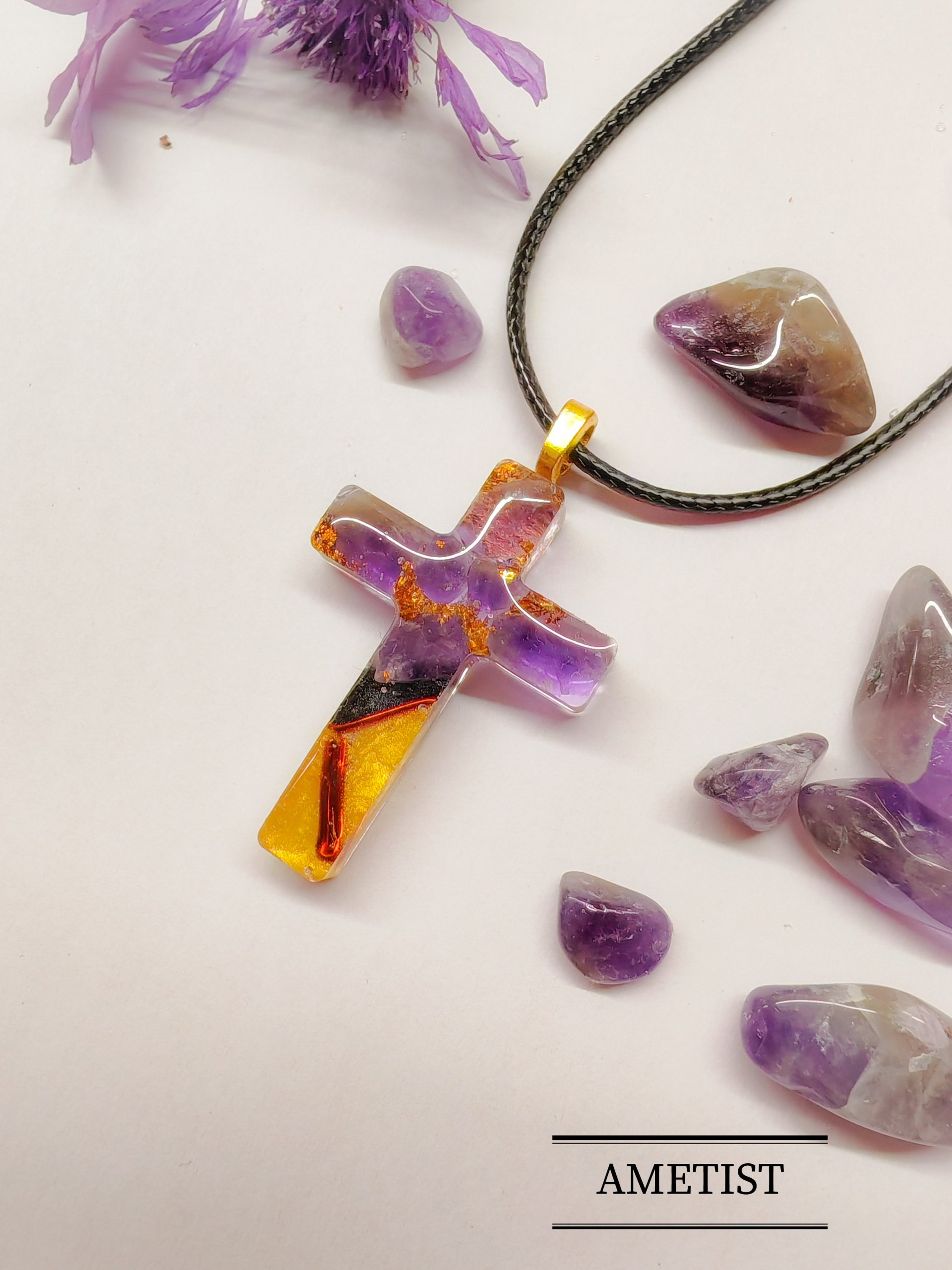 Kamor koli greste, nosite s seboj simbol vere in narave. Ta edinstvena ogrlica ima obesek v obliki križa, skrbno ročno izdelan z vdelavo pristnih ametistov, kalcedonov, peridotov, olivina ali amazonitnih drobcev v visokokakovostno, kristalno čisto smolo.