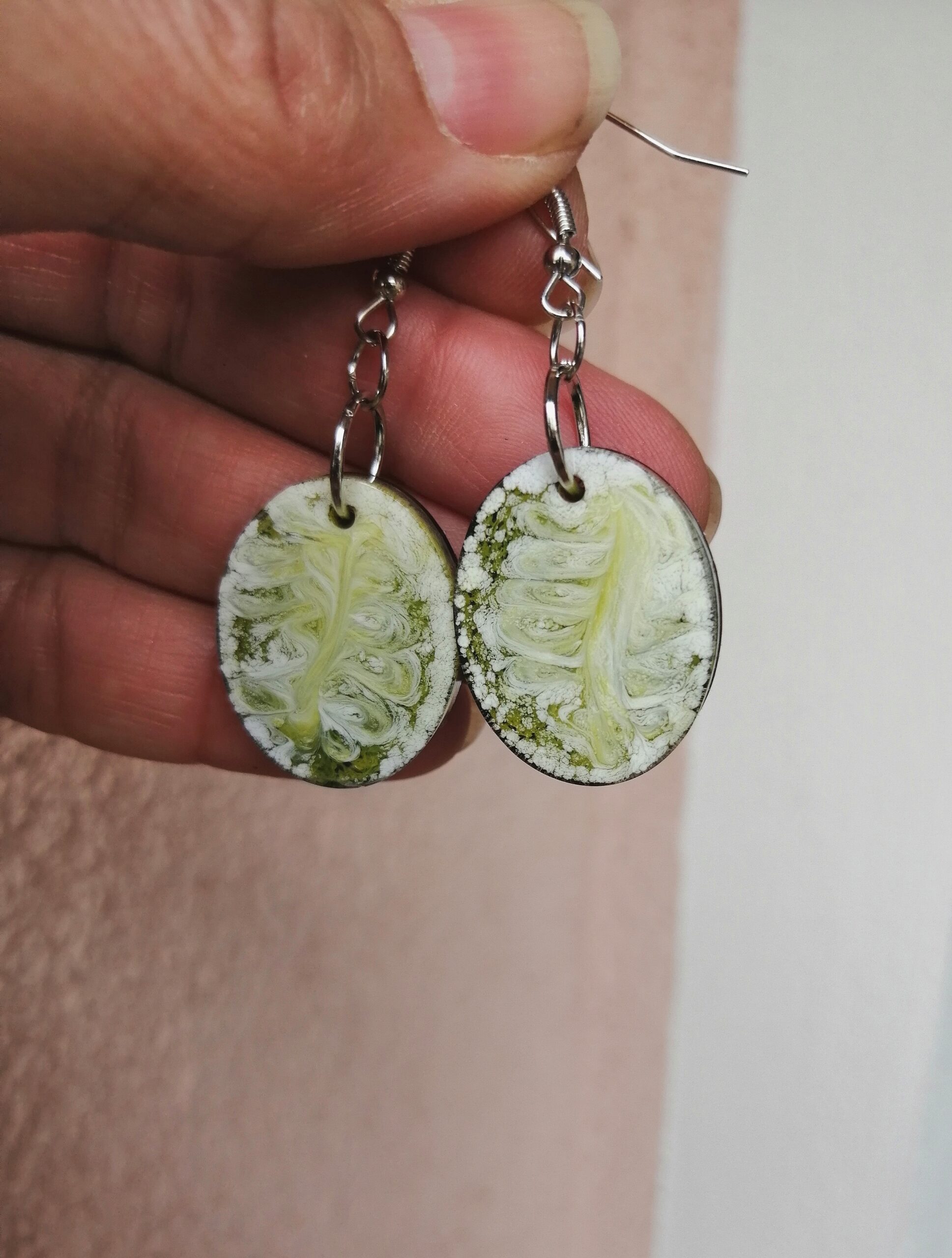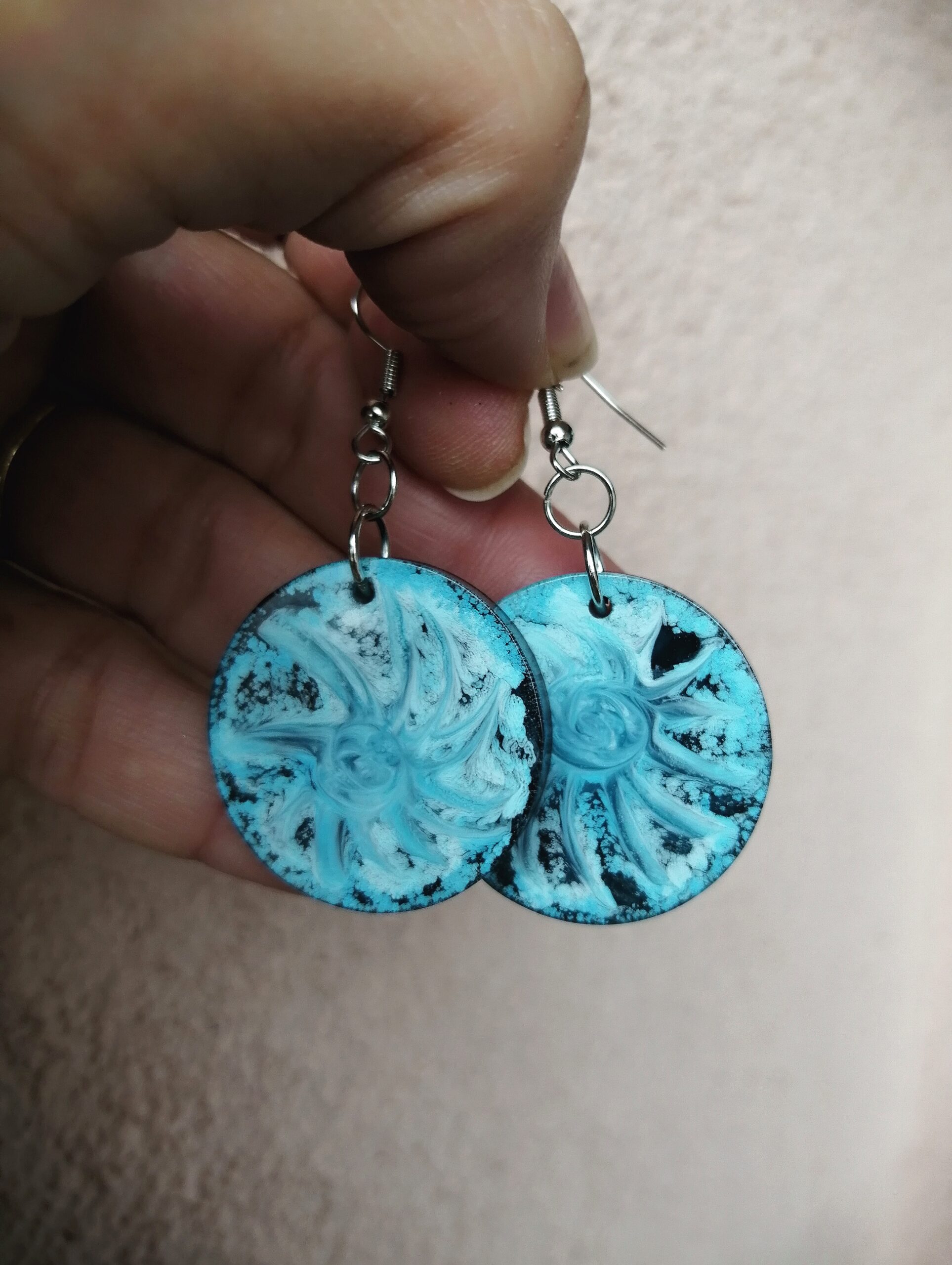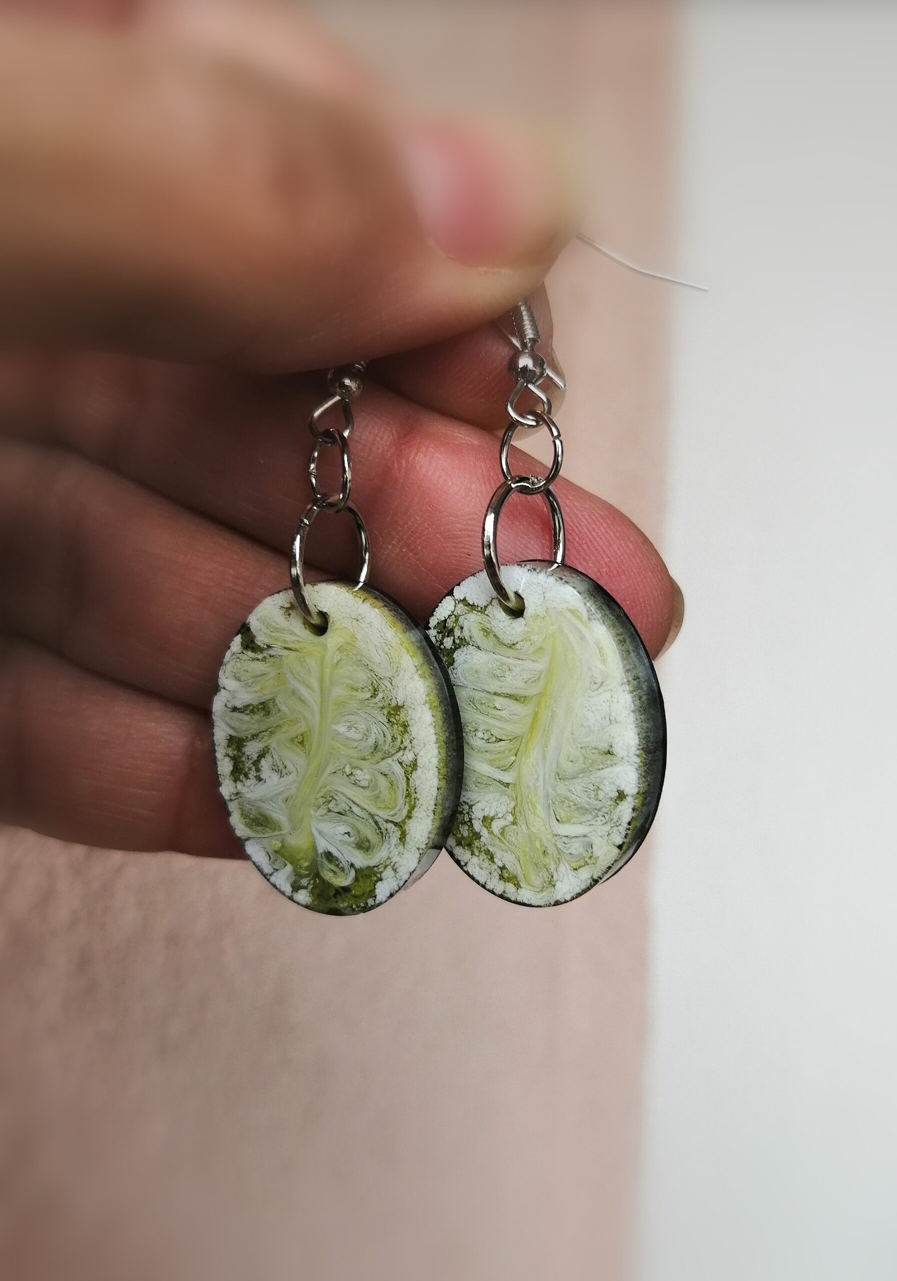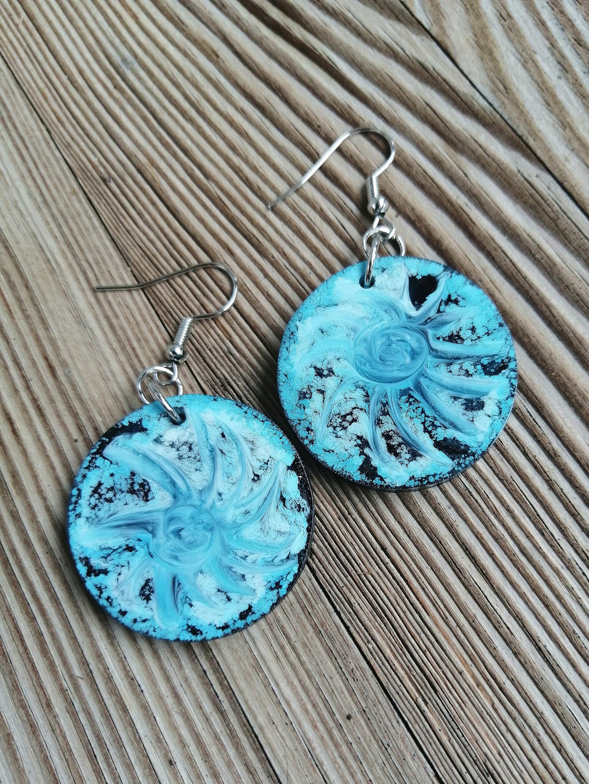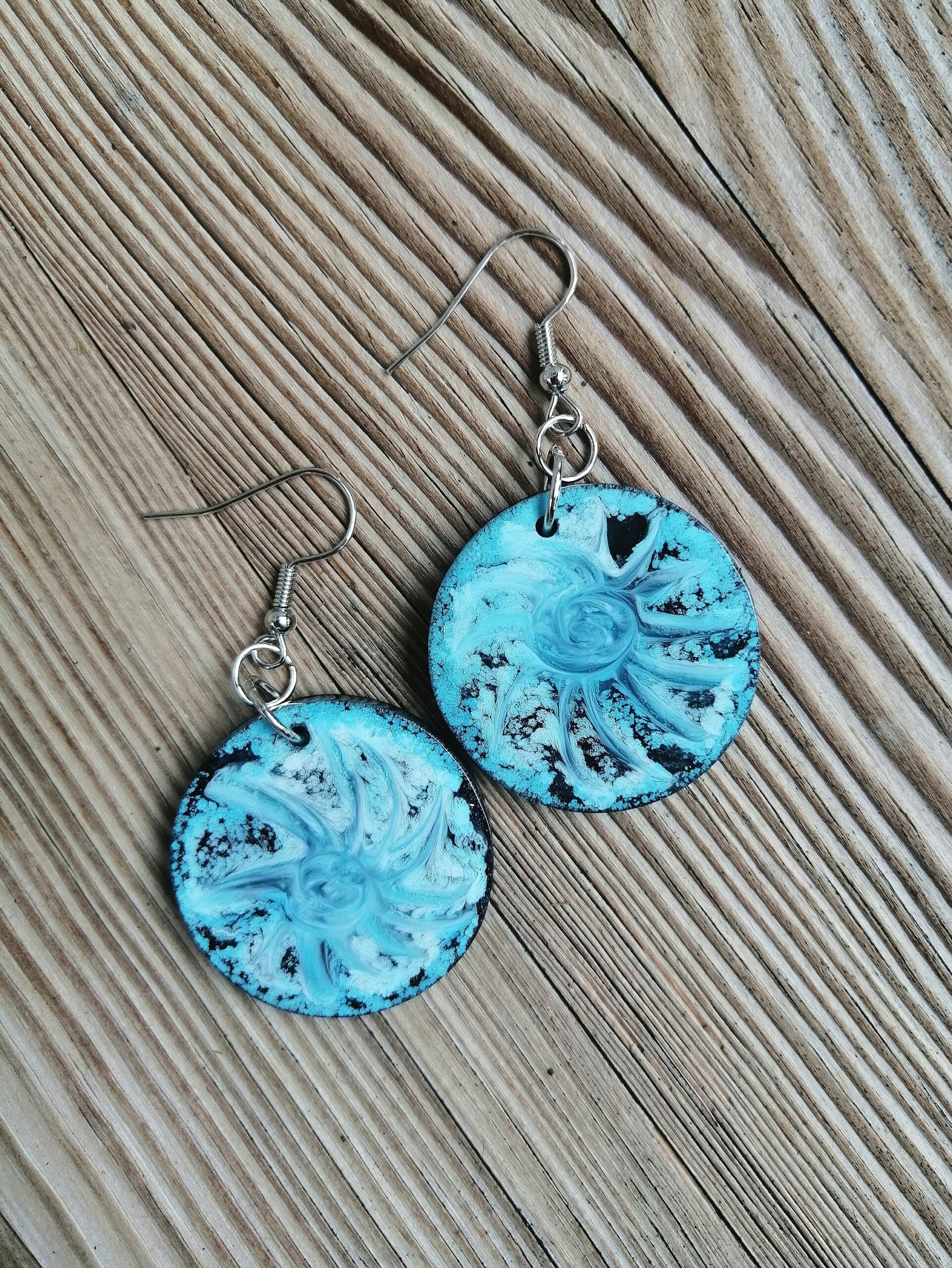 Ročno izdelani viseči uhani so izdelani iz epoksi smole in alkoholnega črnila. Alkoholno črnilo vedno ustvari različne vzorce v smoli, zato je vsak kos nakita unikaten. Tokrat sem se odločila ustvariti dva podobna, a vseeno različna para uhanov. En par je moder in okrogel, drugi je zelen in ovalen. Oba para imata črno ozadje.